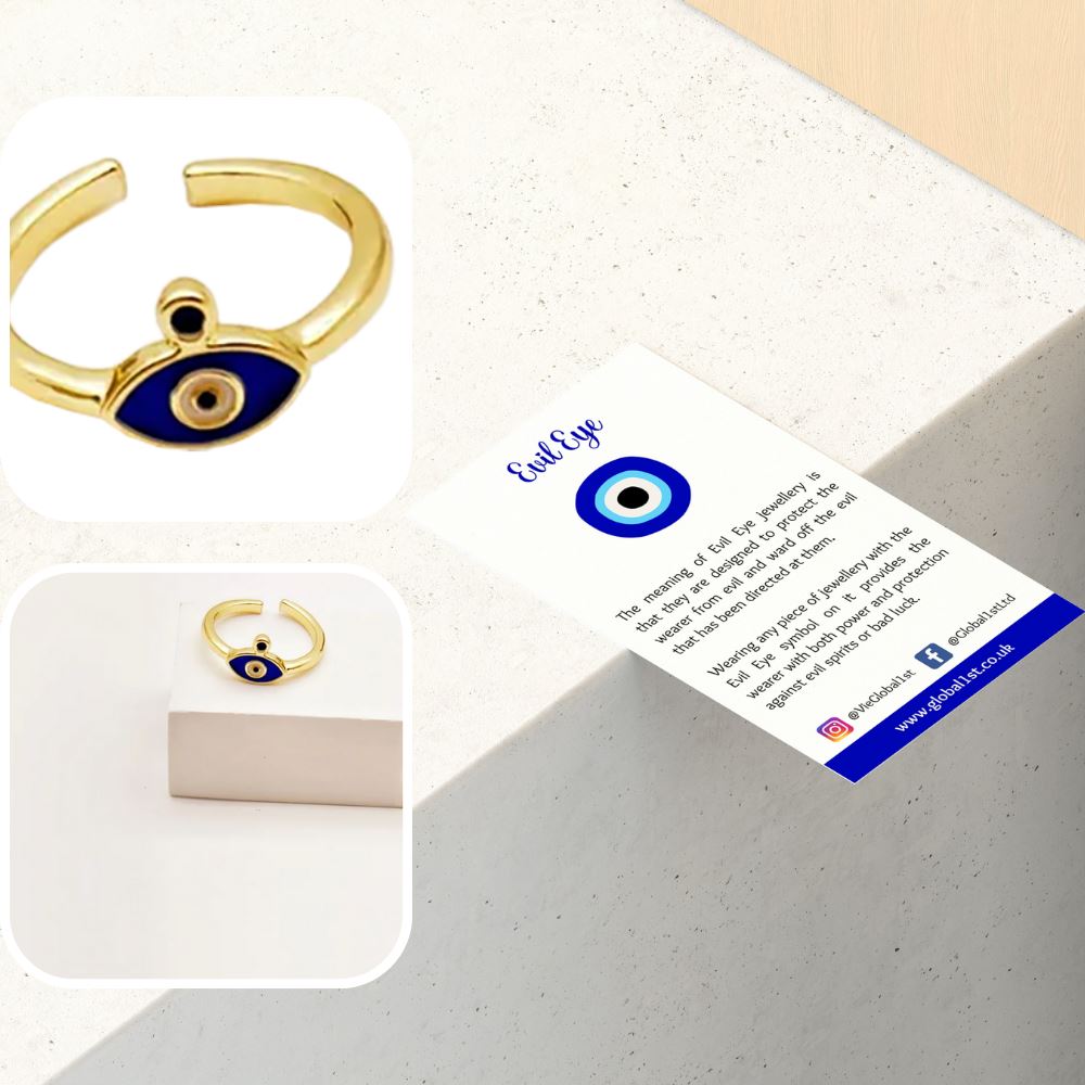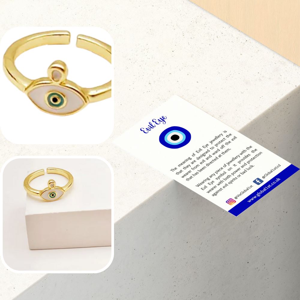Experience protection from negative energy with the stunning Evil Eye Ring. This captivating piece of jewellery showcases the iconic Evil Eye symbol, renowned for its power to deflect evil and usher in good fortune. Crafted from premium materials, the ring seamlessly blends style with spiritual significance, serving as both a chic accessory and a beacon of protection and positive energy. Suitable for daily elegance or special events, the Evil Eye Ring stands as a beautiful reminder of the enduring power of positivity.