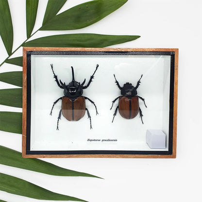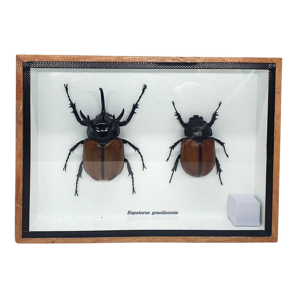 Taxidermy 5 Horned Beetle, Pair, Mounted Under Glass, 15x12.5cm