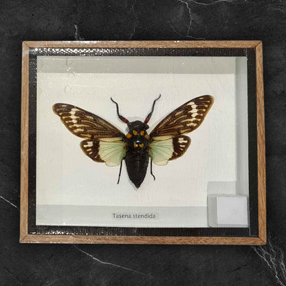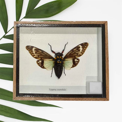 Transform your space with the enchanting allure of our Taxidermy Cicada Blue Wing, exquisitely mounted under glass and measuring 15x12.5cm. Meticulously preserved to maintain its natural splendour, this taxidermy piece adds a touch of whimsy and fascination to any room. Each cicada is ethically sourced and legally imported, ensuring responsible conservation practices. Please note that a preservative is used to protect the specimen and may emit a temporary odour that will dissipate shortly after unpacking.