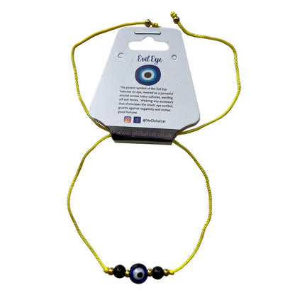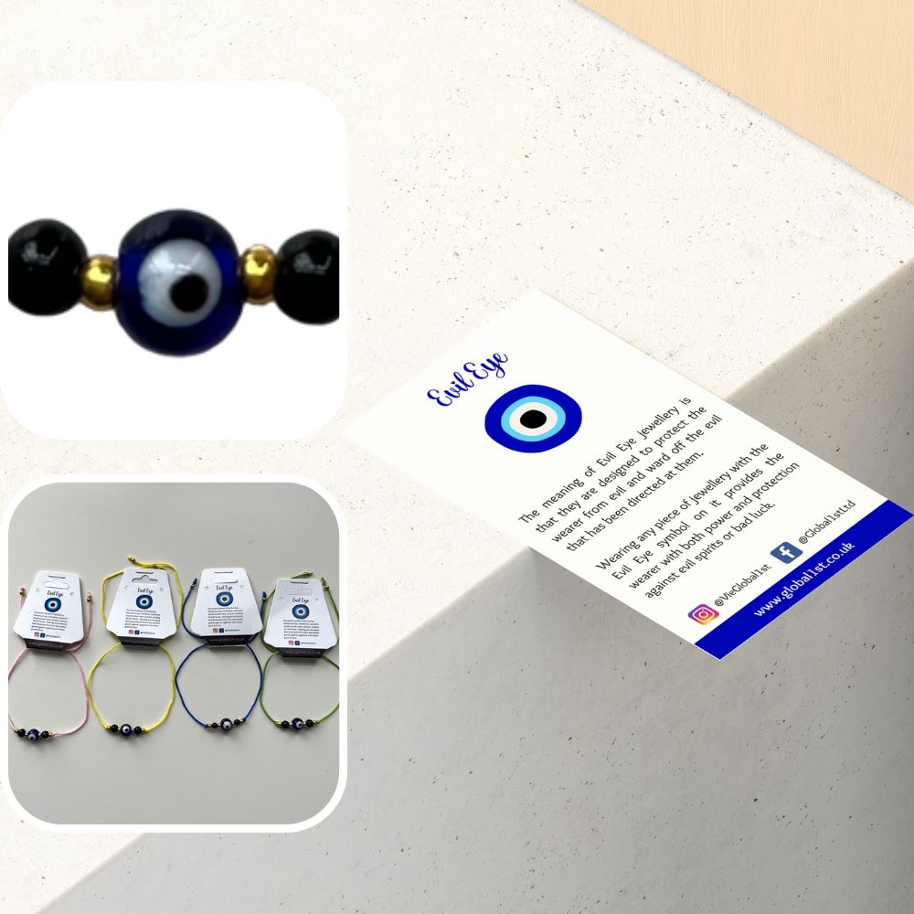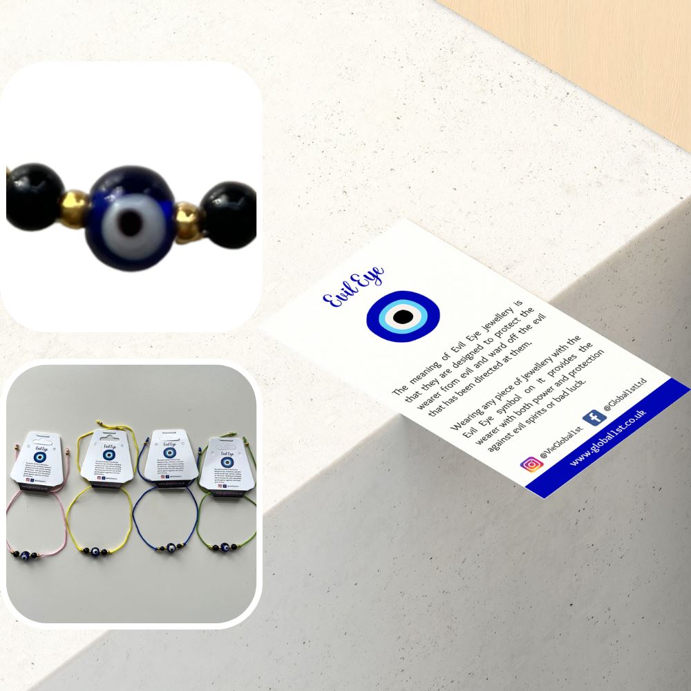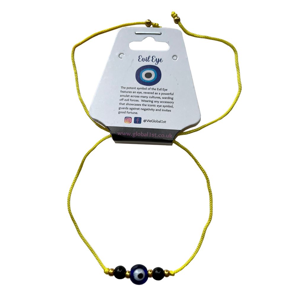 Thread bracelet with Evil Eye glass bead, black beads, and gold-tone accents. Adjustable fit and minimalist design. A strong seller for spiritual shops, fashion retailers, and gift collections.