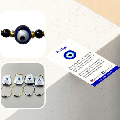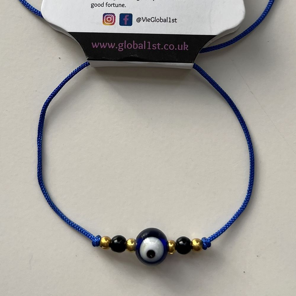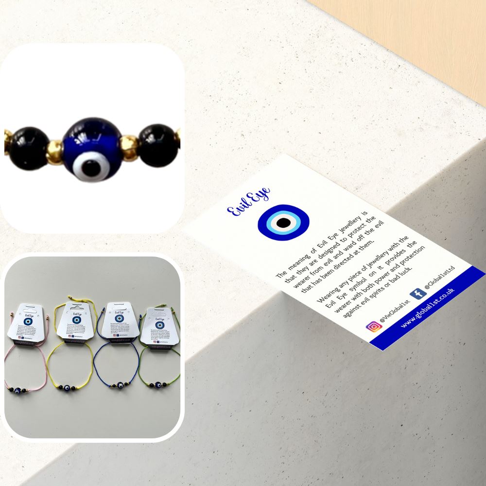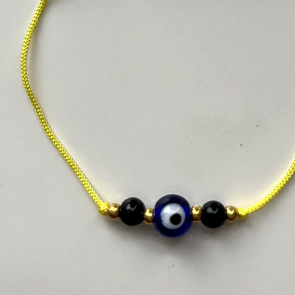 Thread bracelet with Evil Eye glass bead, black beads, and gold-tone accents. Adjustable fit and minimalist design. A strong seller for spiritual shops, fashion retailers, and gift collections.