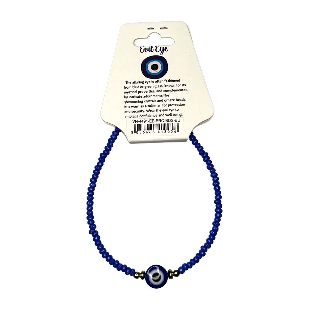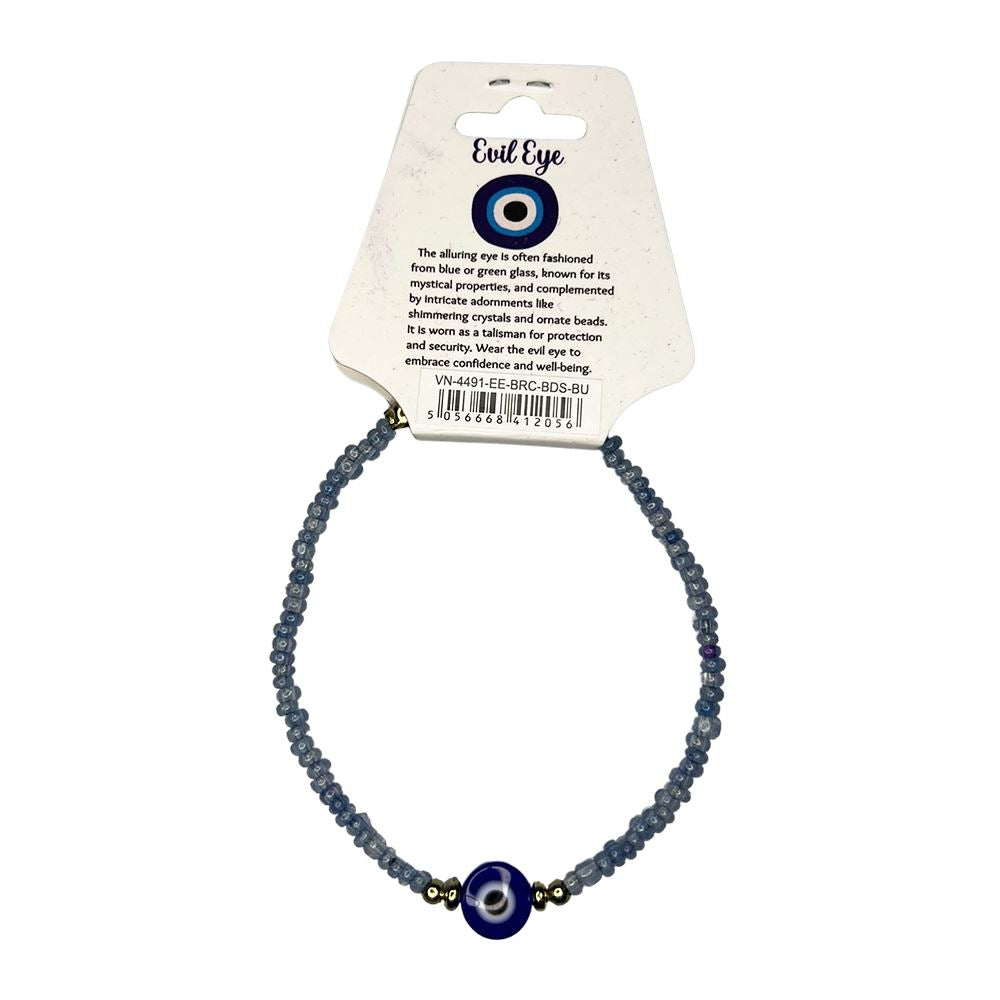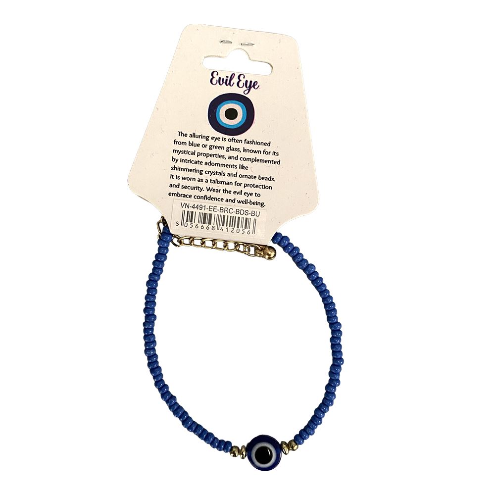 Beaded bracelet with central Evil Eye charm and two gold-tone beads on each side. Lightweight and colourful. A symbolic piece ideal for display and everyday wear.