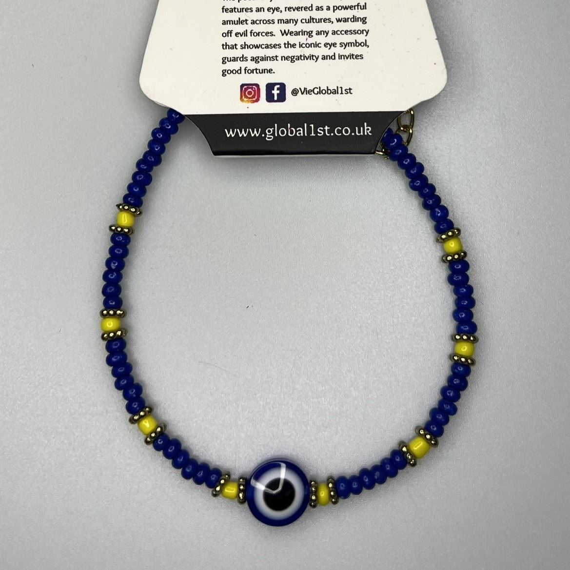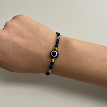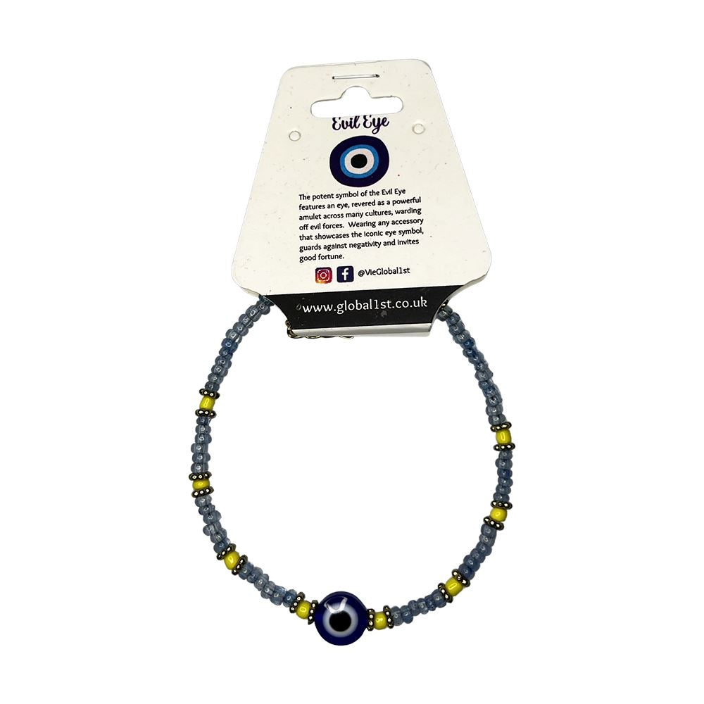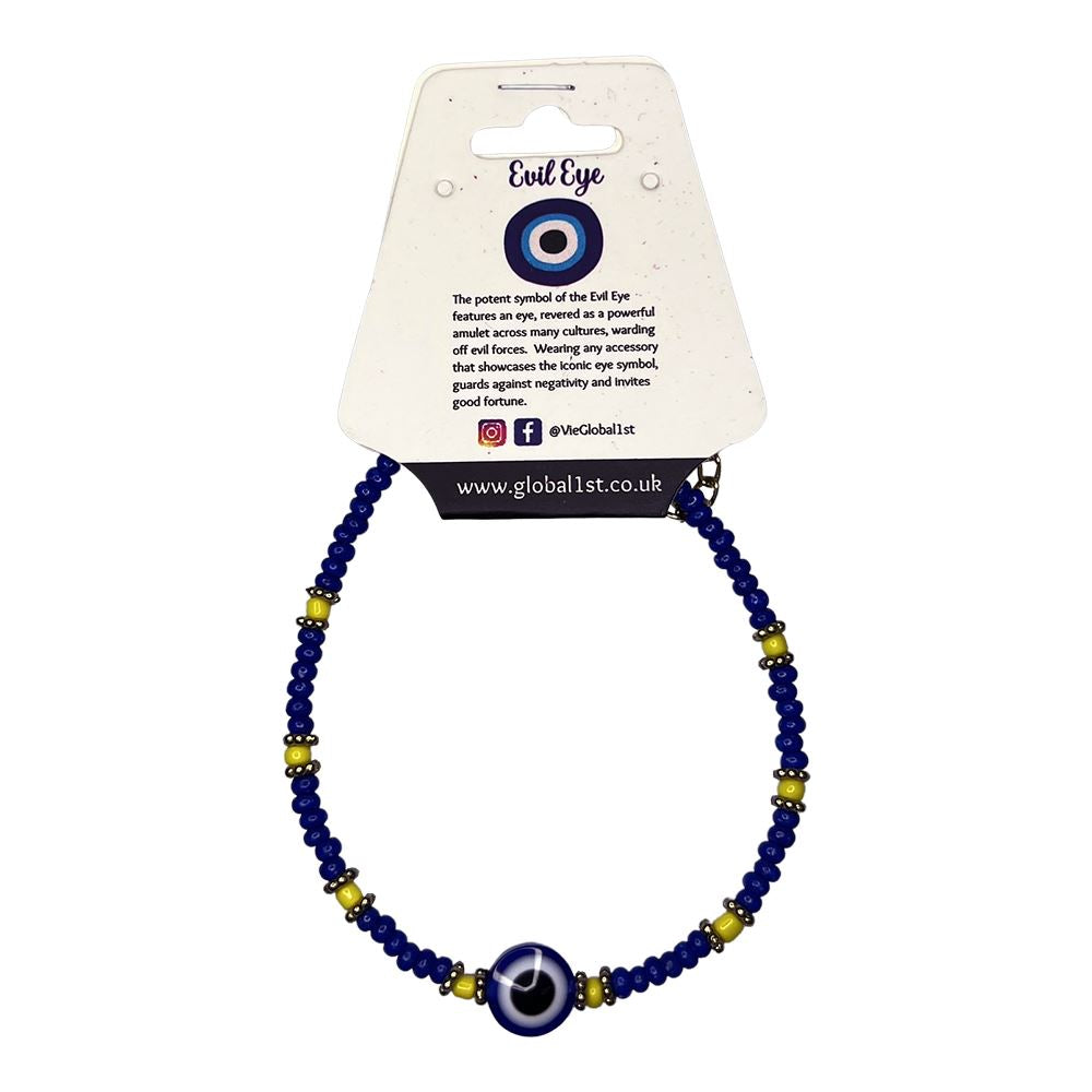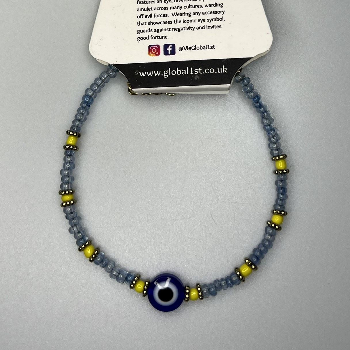 Evil Eye bracelet featuring a central blue glass bead, gold-tone spacers, and scattered yellow seed beads. A meaningful and stylish talisman, perfect for gifting displays and daily wear collections.
