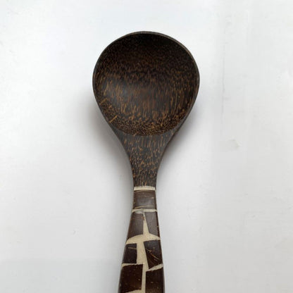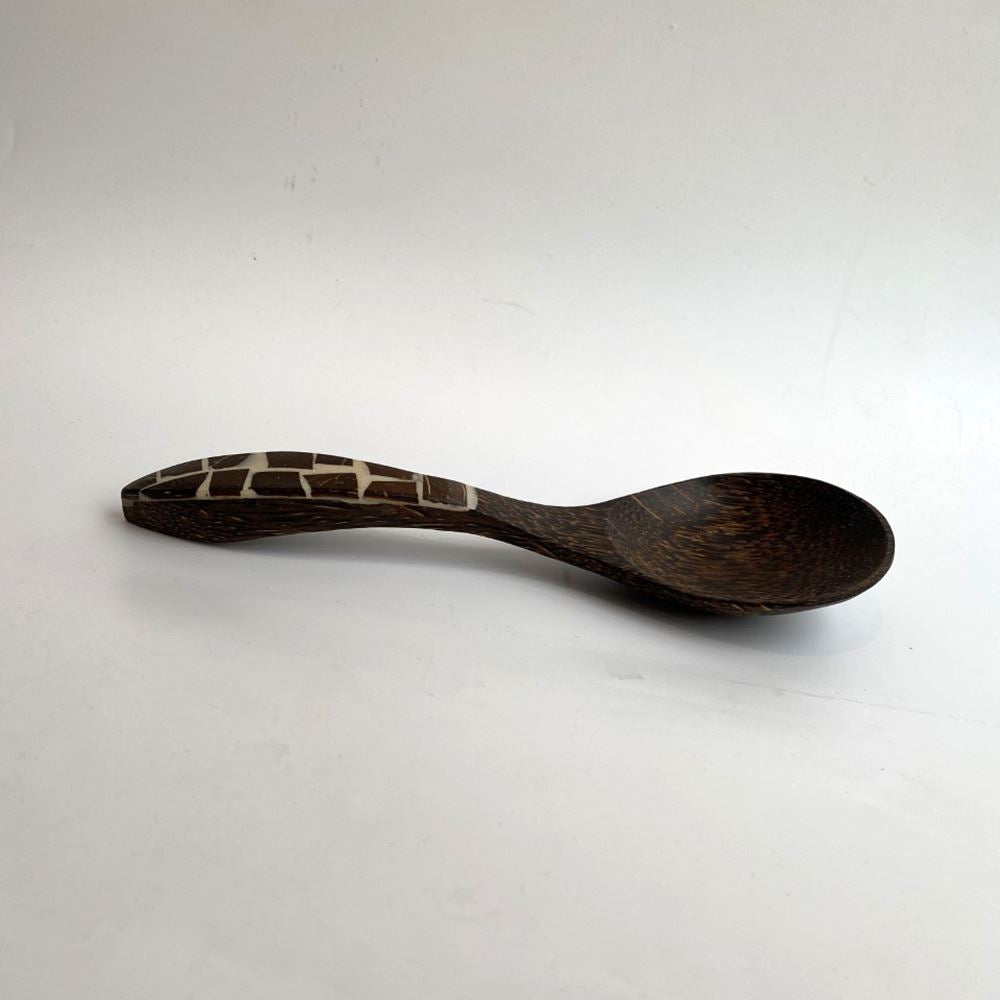 Serving Spoon, Coconut Wood with Coconut Chip Inlay, 22x7cm. This large serving spoon is handcrafted from coconut wood. Each spoon has been skillfully hand-shaped to show the wood's natural beauty. Because of the unique techniques and crafting process, each utensil is truly one-of-a-kind with variations in wood colour and grain pattern from one piece to the next