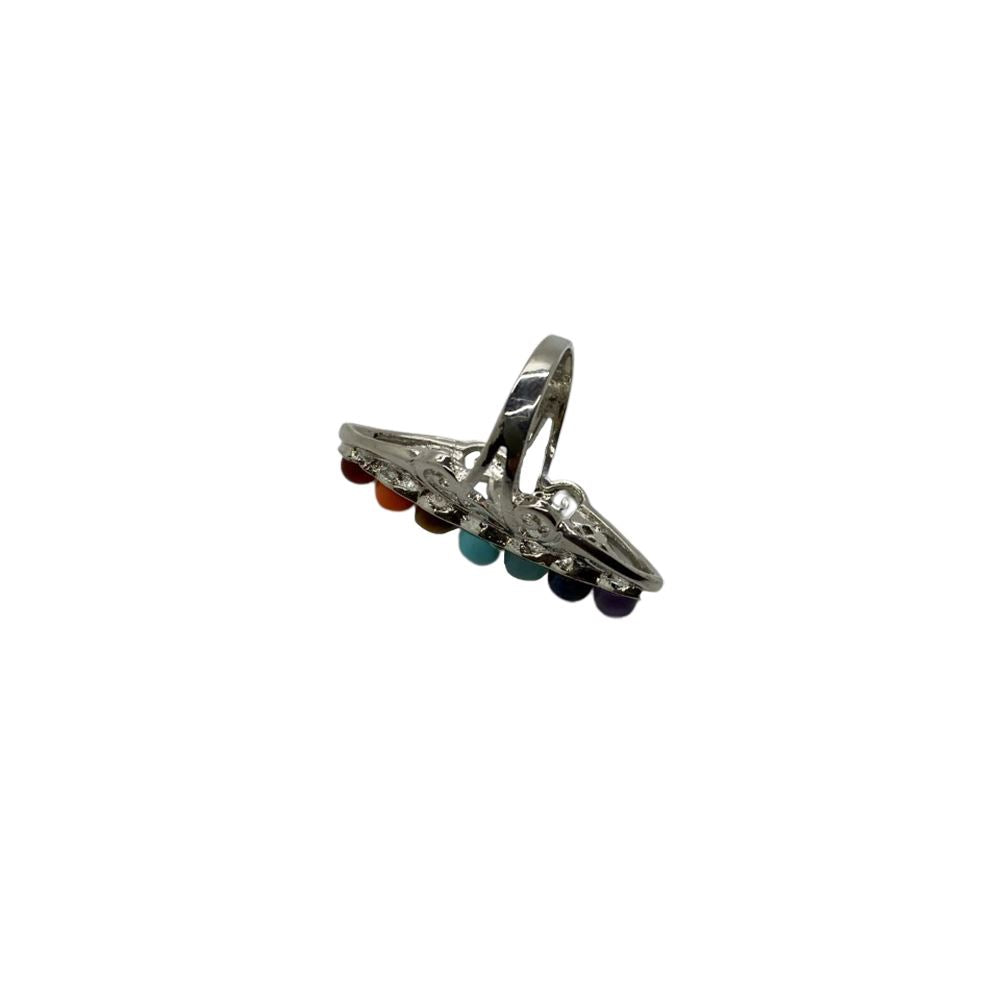 Reach a new level of timeless glamour with our Chakra Jewelry, gemstone ring, size 8. Size: about 18mm in diameter, Ring Surface: 17x39mm. A stunning ring, it has all 7 of the Chakra's colours to heal and maintain a balanced mind, body and soul. Its contemporary and modern design makes it perfect and versatile to be worn on any occasion. Natural stones might vary slightly in colour and inclusions, making every piece truly unique. Comes with a pouch.