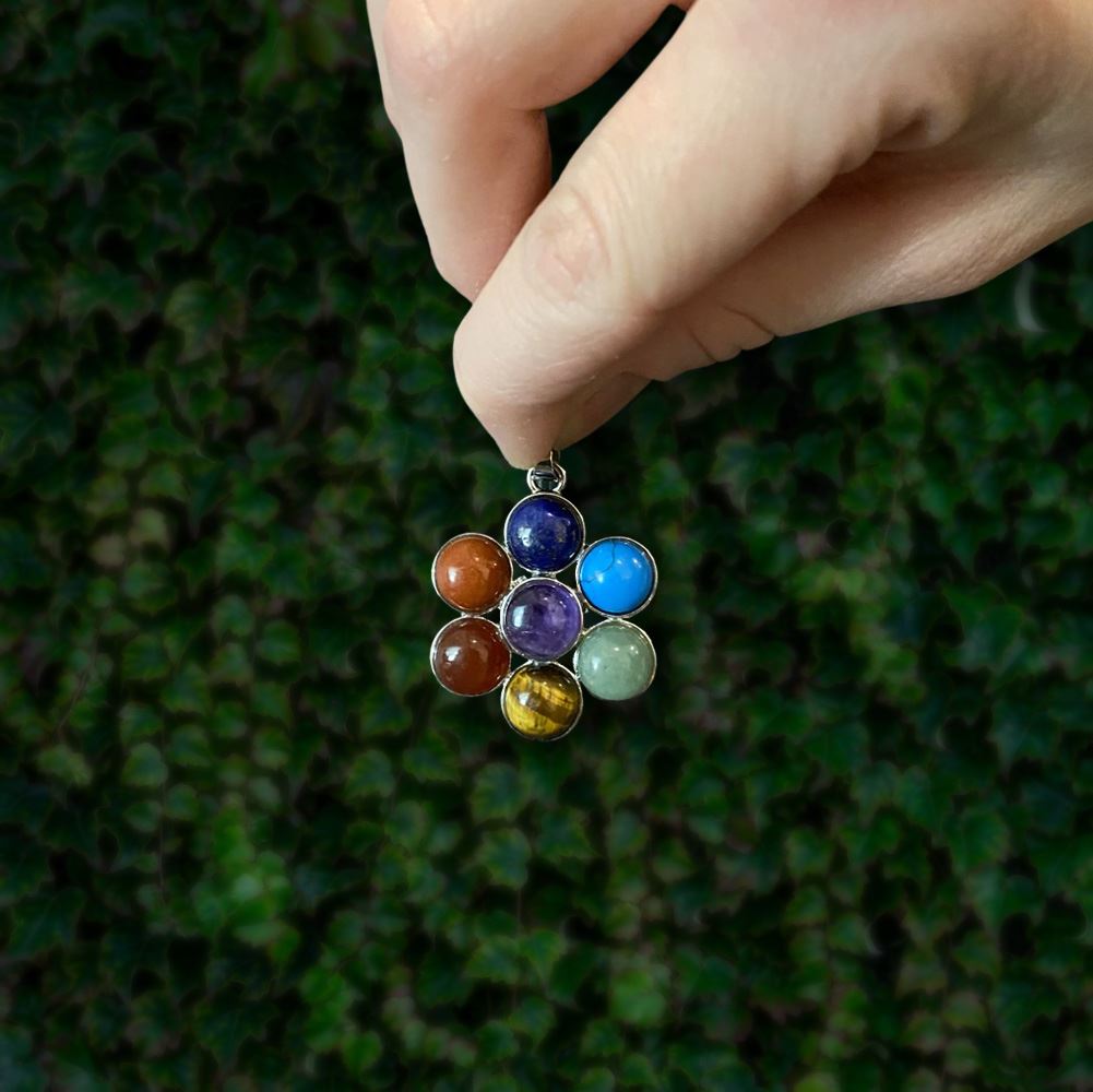 Flower Gemstone Pendant, Chakra jewelry, mixed stone. Size: about 33mm wide, 41mm long, 8mm thick, hole: 4x7mm. Made up of seven colours, it symbolizes the meaning of beauty, health, good luck and healing. Helps you protect negative emotions around you and increase positive energy, helps to balance the chakras and give purification to the body, bringing balance to the chakra energy. Each spiritual coloured gemstone is strongly connected with a specific Chakra to raise your vibration and to emit a positive flow of energy. Comes with a pouch. Please Note: These pendants may include Synthetic Turquoise, Natural Amethyst, Red Jasper, Lapis Lazuli, Green Aventurine, Tiger Eye, Carnelian, but as it is a mixed product, the stone type is delivered randomly.