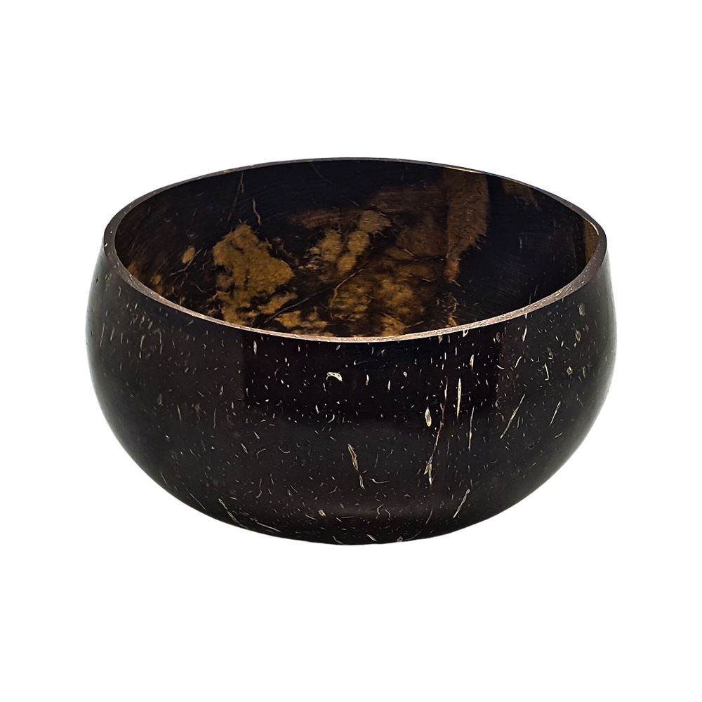 Polished Coconut Bowls handcrafted from upcycled coconut shells. Each piece showcases unique natural textures and warm tones, perfect for sustainable kitchenware collections and eco-conscious homeware displays. Ideal for serving cool or room-temperature dishes.
