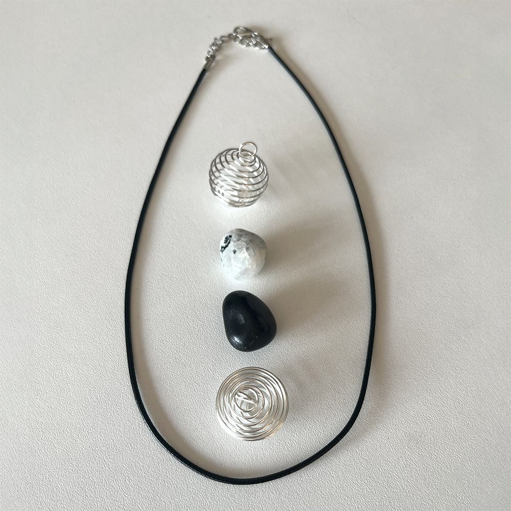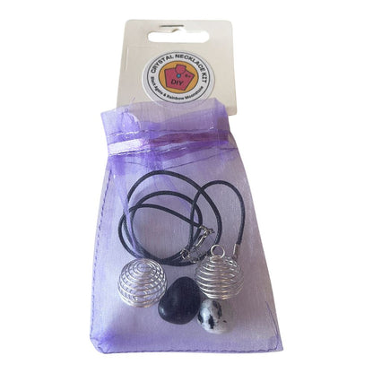 Unleash your creativity with our Gemstone Necklace DIY Kit, perfect for crafting unique and personalised jewellery pieces. This kit includes everything you need to create your own necklace: a black cord, spiral cage pendants, and two gemstone crystals - one tumble and one rough-cut crystal. The spiral cage pendant allows for interchangeable crystals, so you can easily swap them out to suit your mood or style. Get creative and customize your necklace, or exchange crystals with friends for a fun and unique accessory. Whether you're a beginner or an experienced crafter, this DIY kit is sure to inspire your creativity and spark your imagination.