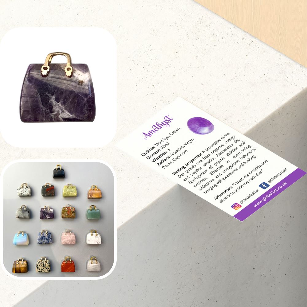 Mini Crystal Handbags (approx. 2�2.5cm), hand-carved from natural gemstones. Each piece features unique variations in colour and texture, reflecting the beauty of natural stone. Ideal for crystal shops, gift retailers, and decor collections.