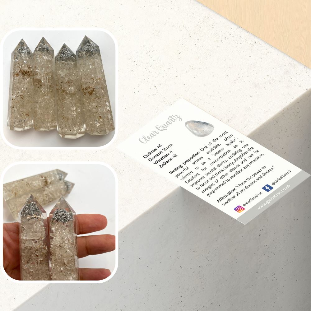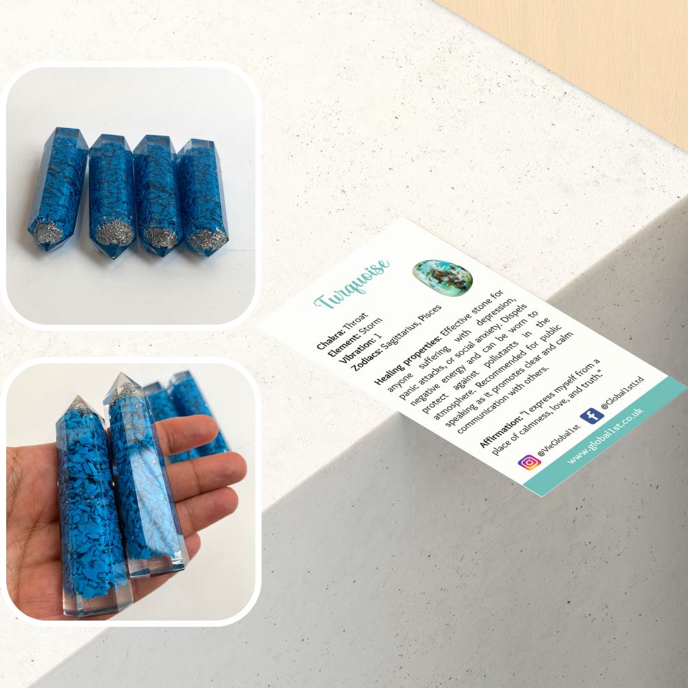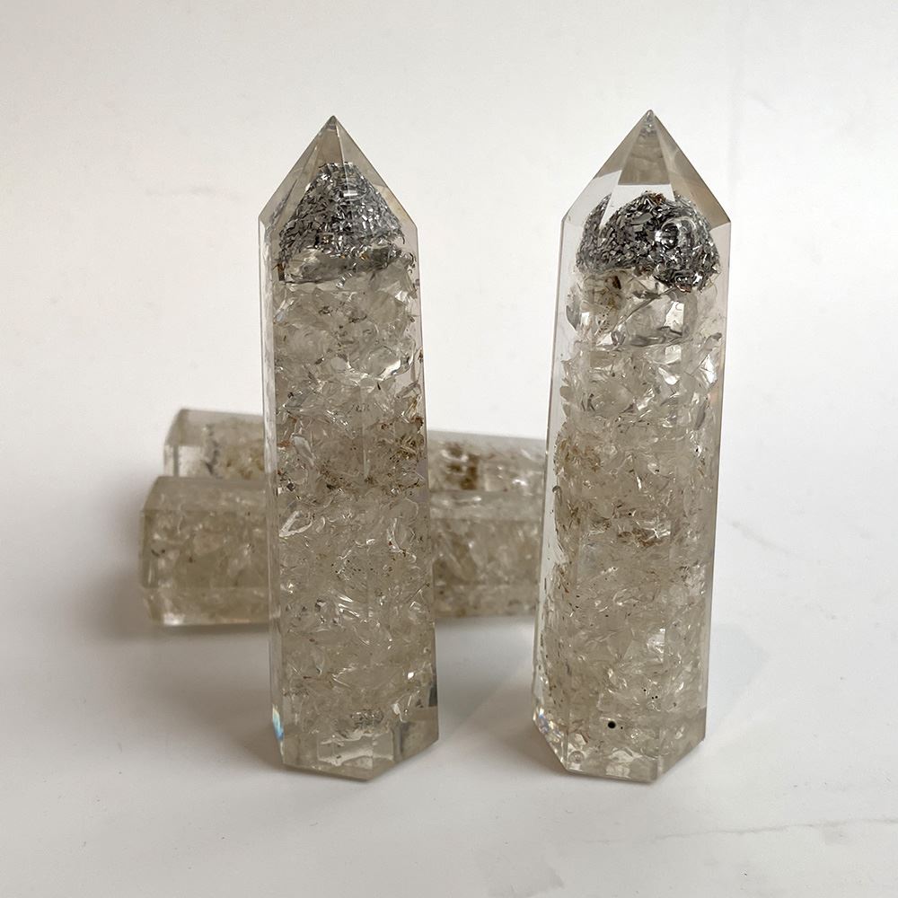 Orgonite Obelisk Towers in 8x2x2cm and 10-12cm sizes. Handcrafted from gemstones and metal to promote energy balance. Ideal for crystal shops, spiritual boutiques, and holistic wellness ranges.