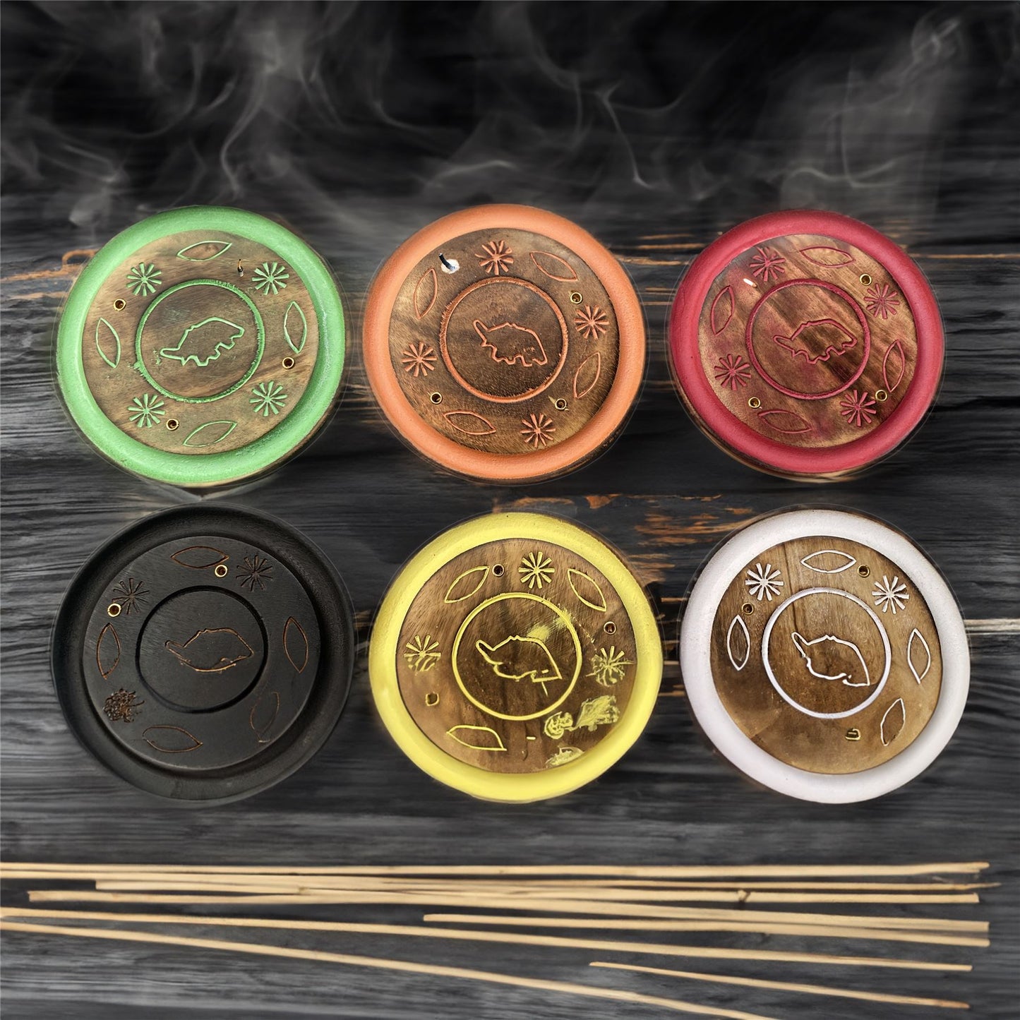 Round Elephant Design Incense Holder, Mango Wood, Single, Assorted Colour, 9.5cm