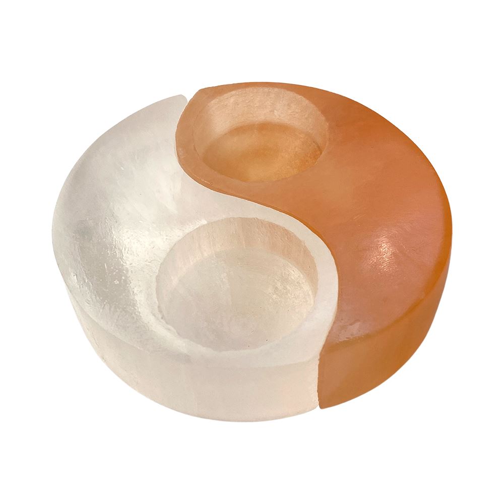 Selenite Yin Yang Tealight Holder, crafted from white and orange selenite. A symbolic decor piece ideal for spiritual shops, combining elegant aesthetics with energy-cleansing properties.