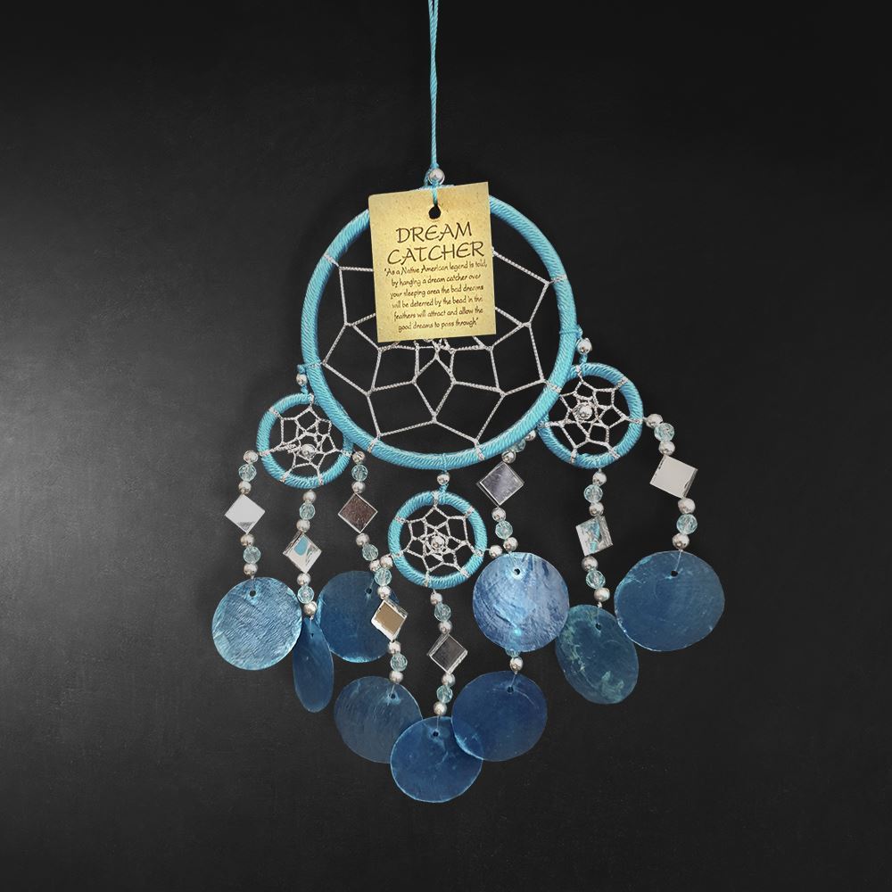 Capiz Dream Catcher is a spiritual tool used to help assure pleasant dreams to those that sleep under it. This handcrafted dream catcher, enhanced with beautiful beadwork, features a 9 cm ring hand wrapped in suede cord, followed by four smaller rings. Only good dreams can pass through while the bad dreams are caught in the webbing and destroyed by the first rays of the morning light.
