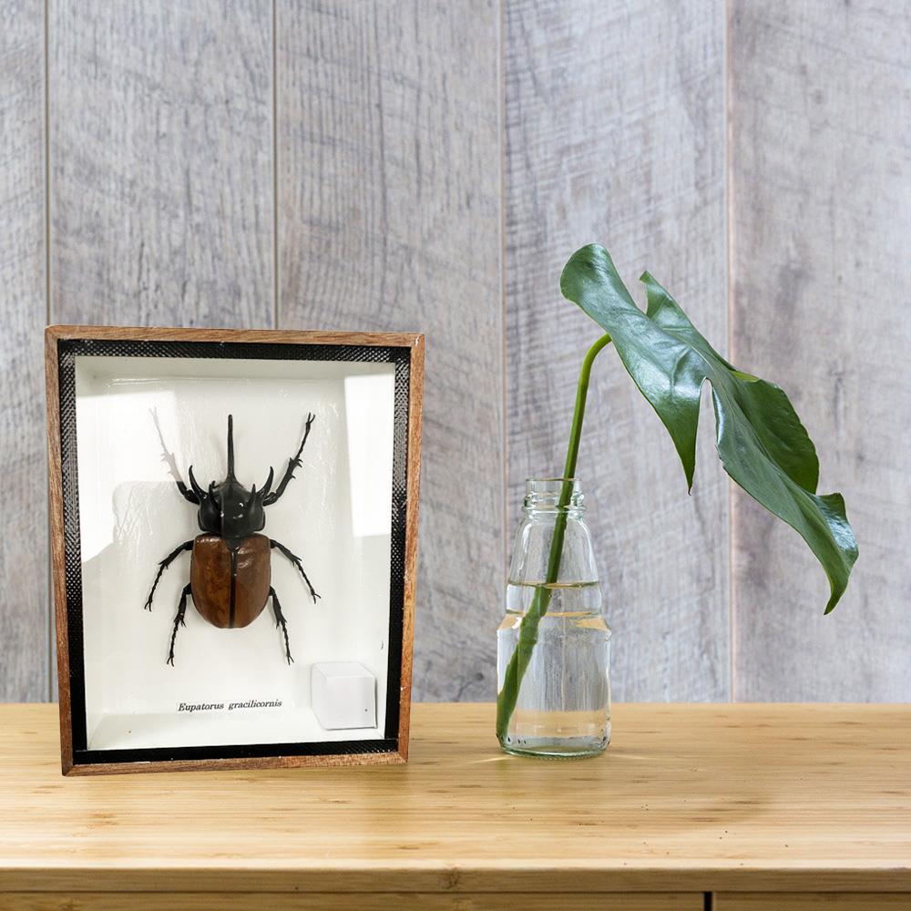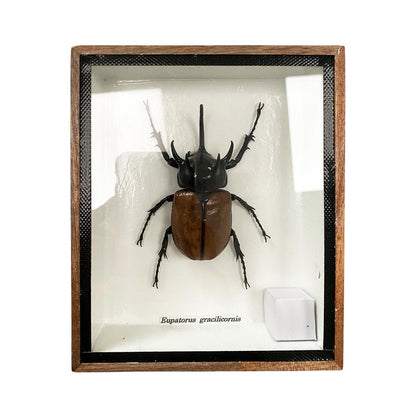 Introduce a touch of entomological intrigue with our Taxidermy 5 Horned Beetle, mounted under glass and encased in a 12.5x15cm wooden frame. This authentic preserved specimen serves as a fascinating conversation starter, whether displayed on a wall or bookshelf. Each beetle is meticulously preserved to maintain its natural form, making it a striking addition to any collection. Our taxidermy specimens are ethically sourced and legally imported, ensuring sustainability and authenticity. Please note that a preservative is used during preservation, which may emit a temporary odour that dissipates over time. Elevate your decor with this unique piece of natural history, or surprise a fellow enthusiast with a thoughtful and distinctive gift.