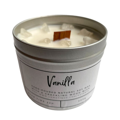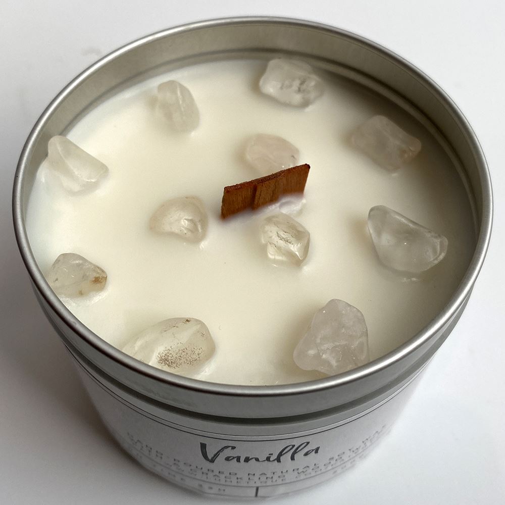 Aluminium Tin Candle, Vanilla with Clear Quartz Crystals