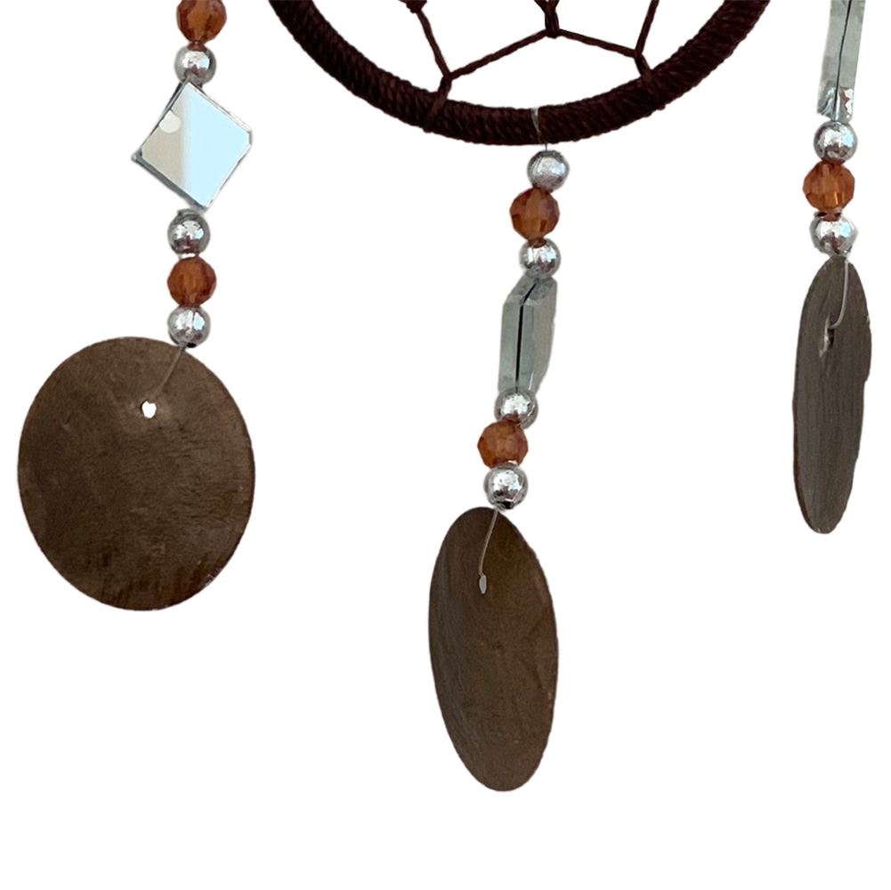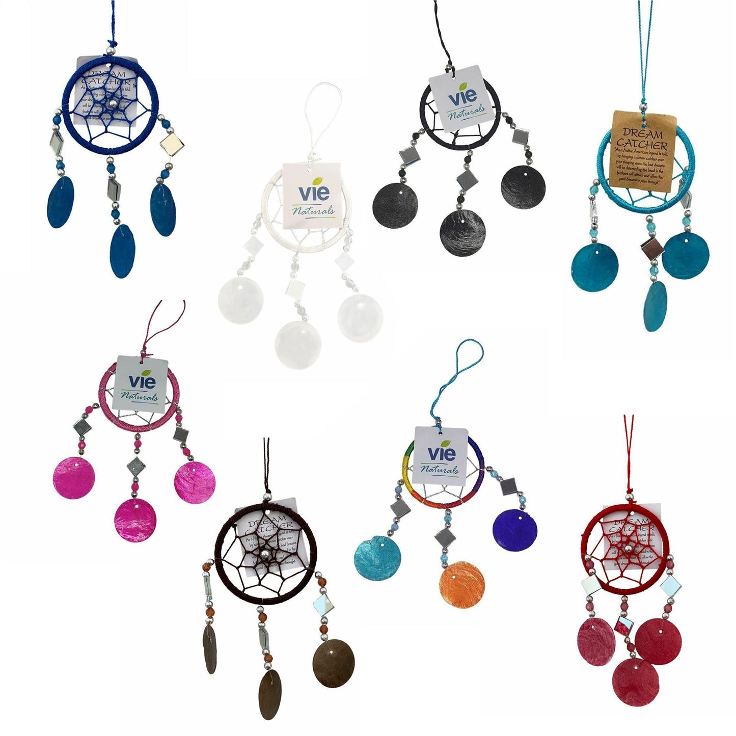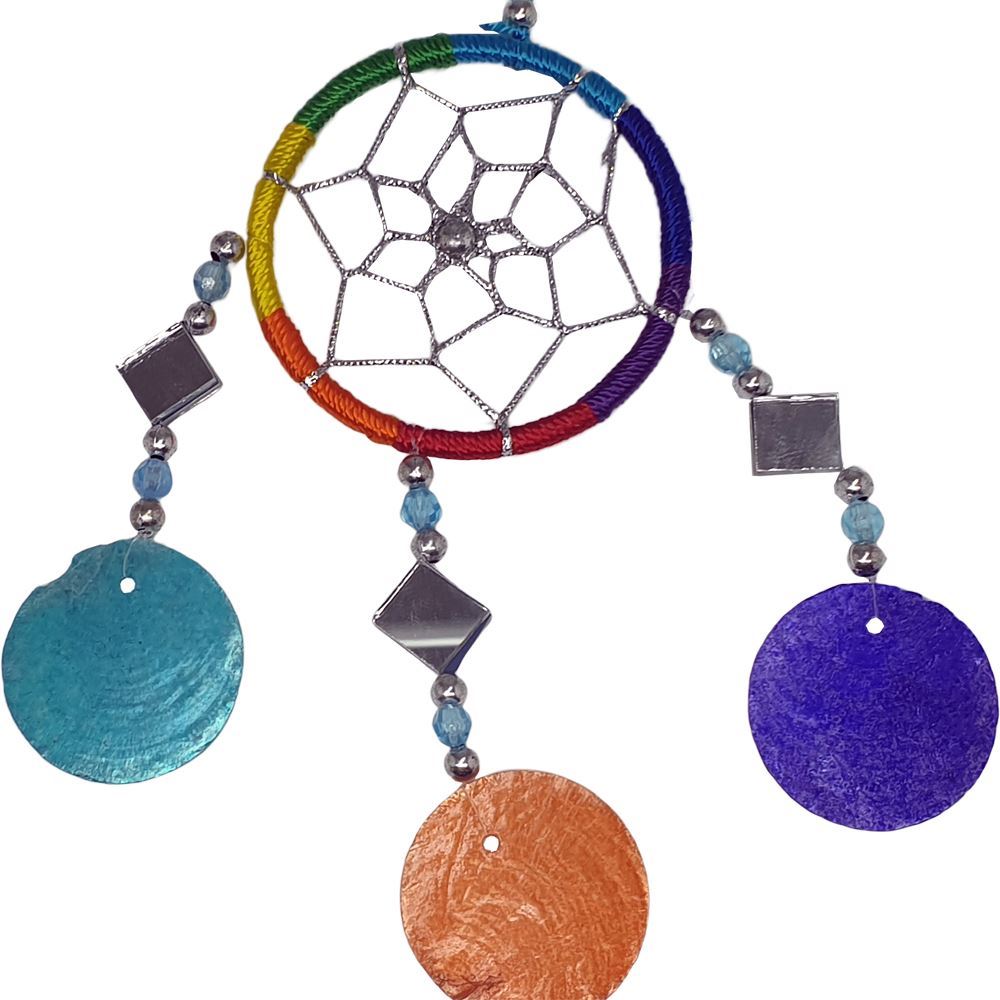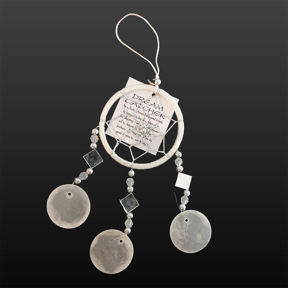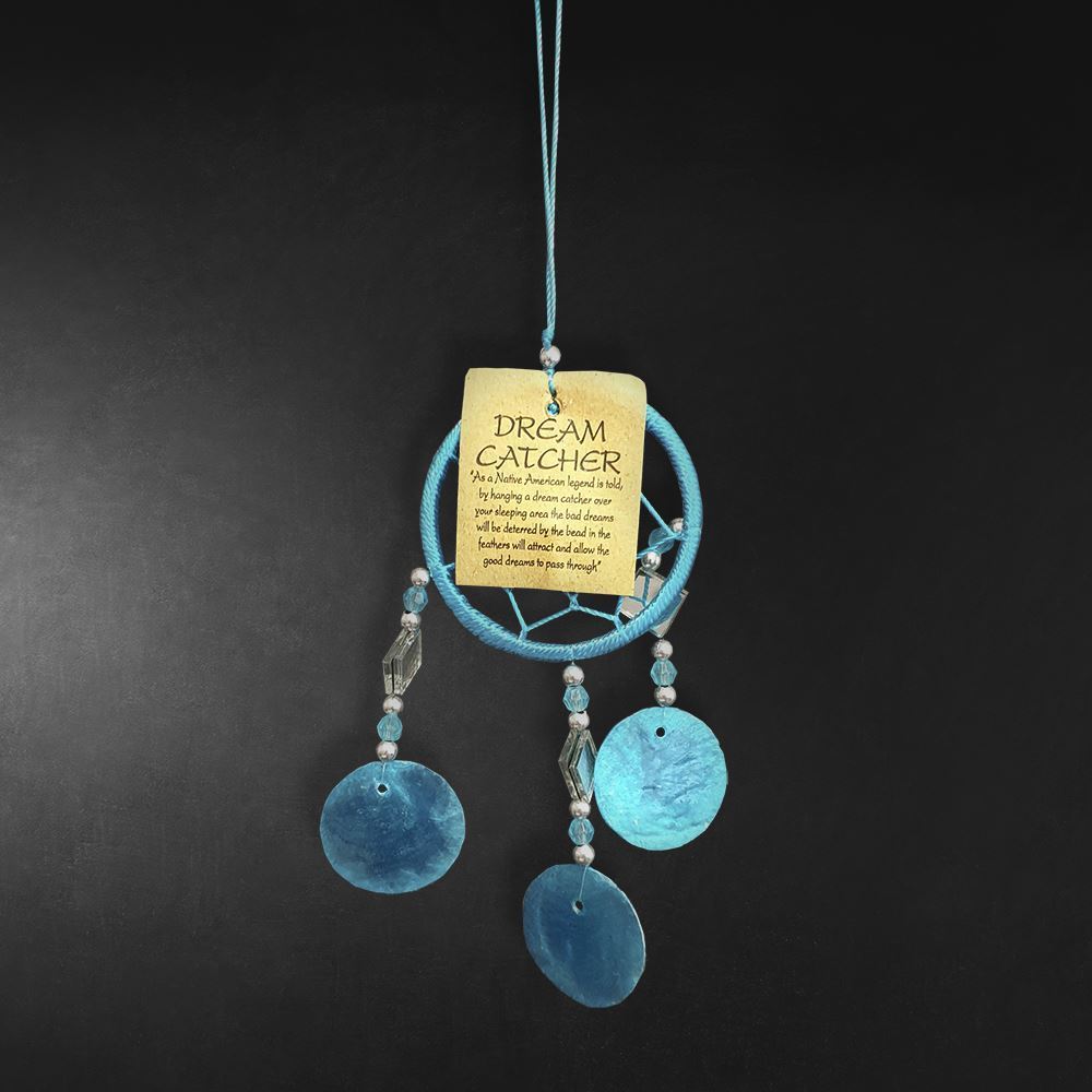 The Capiz Dream Catcher is a spiritual tool used to help assure pleasant dreams to those that sleep under it. This handcrafted dream catcher, enhanced with beautiful beadwork, features a 6 cm ring hand wrapped in the suede cord. Only good dreams can pass through while the bad dreams are caught in the webbing and destroyed by the first rays of the morning light.