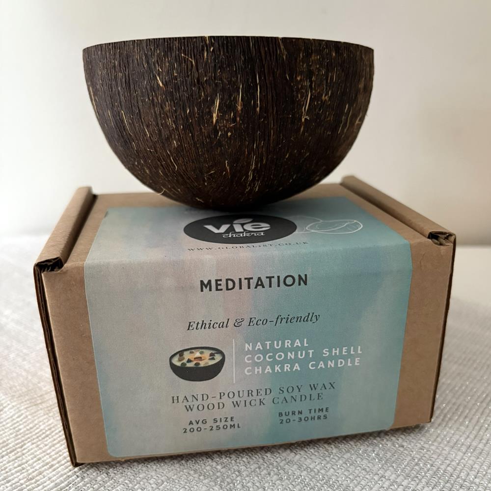 Coconut Shell Candle with Meditation scent and 7 Chakra gemstones. Made with soy wax and wood wick, approx. 200-250g. Ideal for eco shops, gift retailers, and wellness collections focused on sustainability and mindful living.