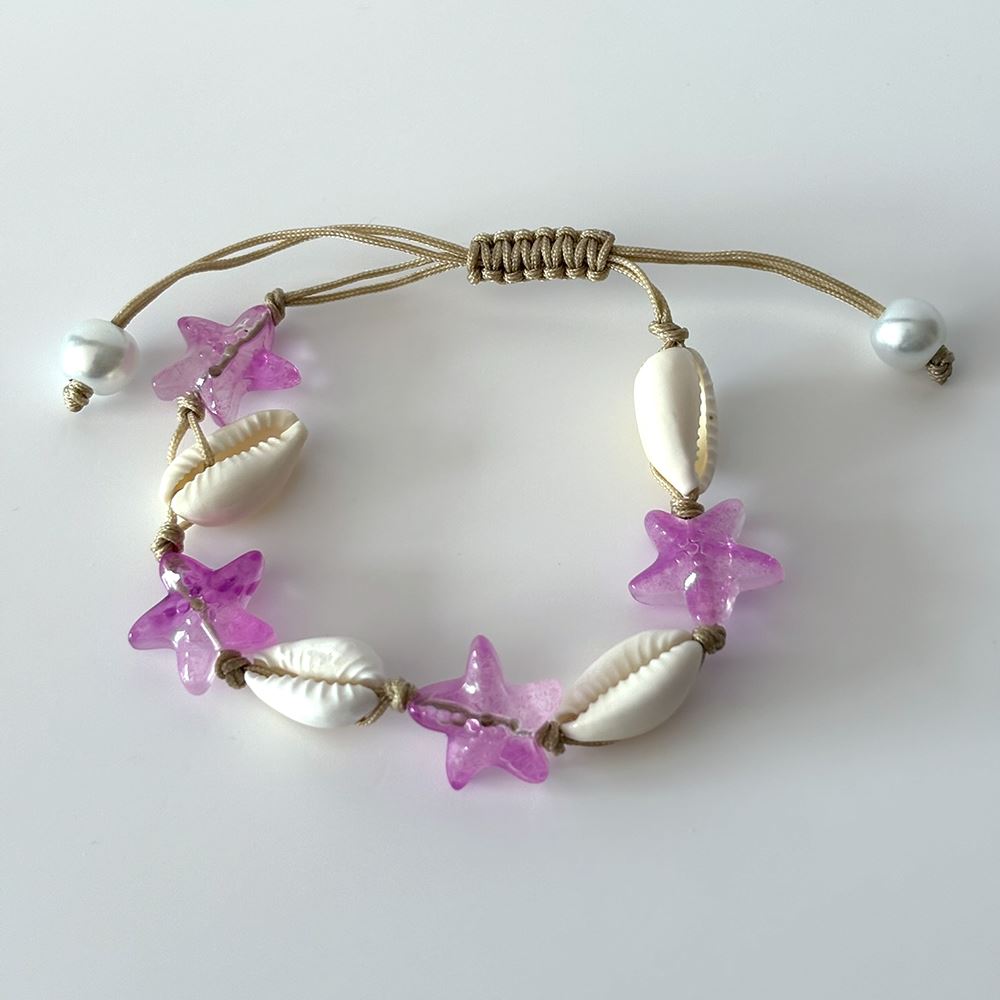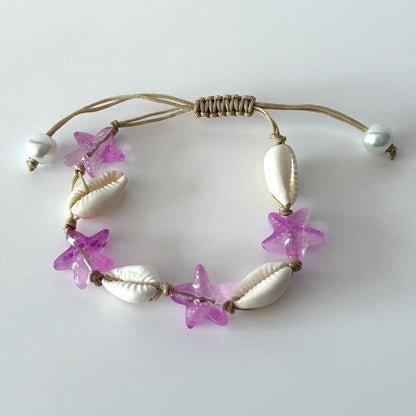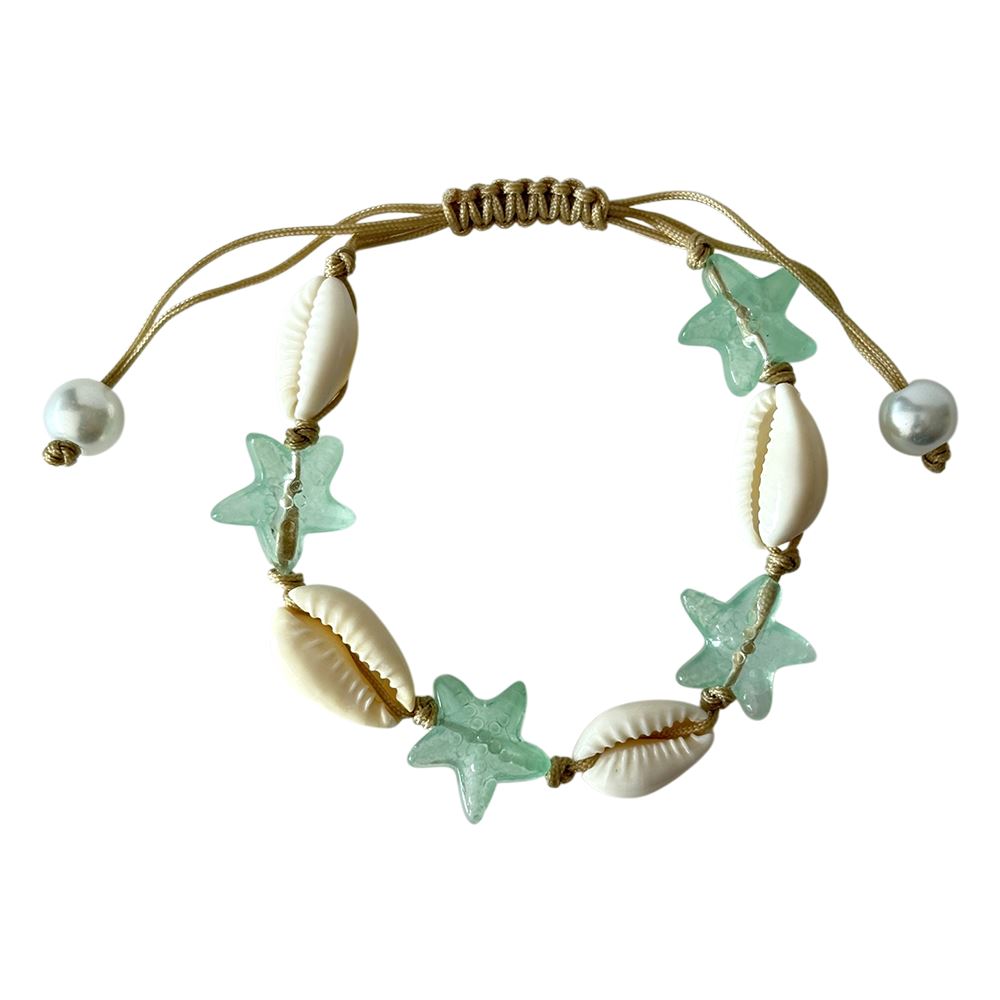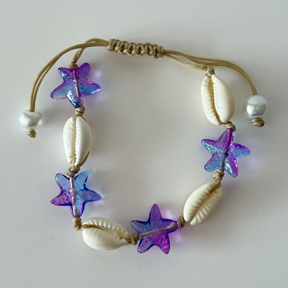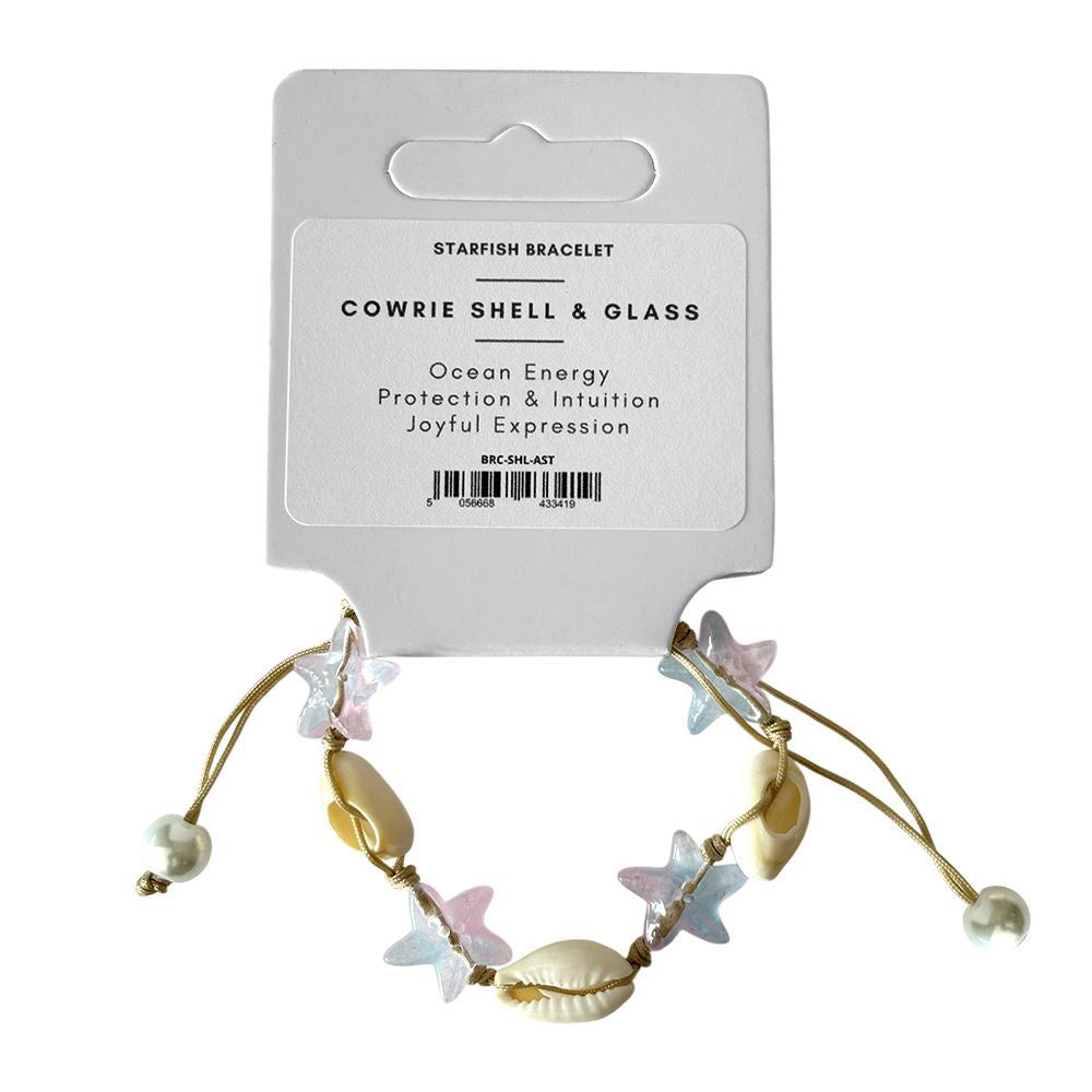 Cowrie Shell & Glass Starfish Bracelet with adjustable cord. Features glass starfish beads and real cowrie shells. Assorted colours.