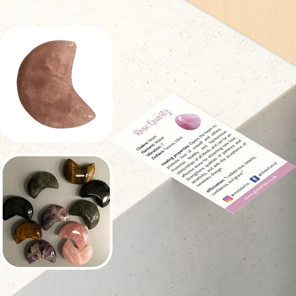Crescent Moon Crystal, 3x2cm. These assorted moon-shaped healing gemstones have various healing functions, promoting relaxation, peace, harmony, positive thoughts, confidence, and the free flow of energy through the heart. They are portable and lightweight, making it easy to carry them in your pocket, bag, or purse.