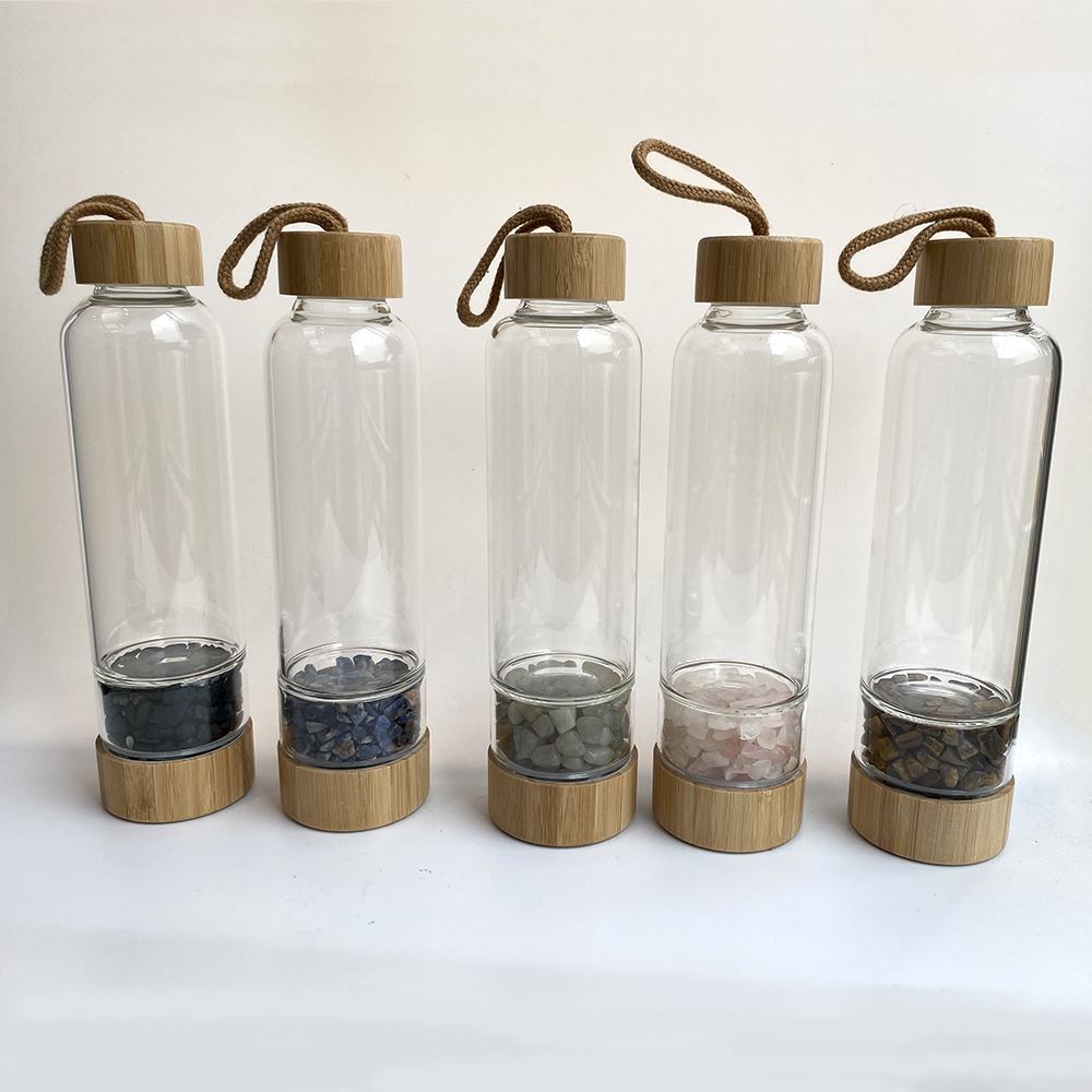 Beautifully finished glass crystal water bottles with bamboo tops and bases, and a handy carry cord. Simply choose your preferred crystal and add water to create an elixir filled with natural energies. Practical chamber base design; gemstones can be bought separately and changed according to mood and preference. 400 ml capacity, 25x6x6cm. Each bottle is supplied with gemstones. Please notice that the colours of gems may vary due to their natural origin.