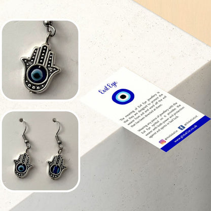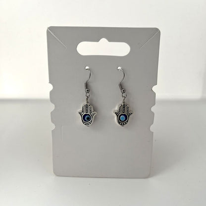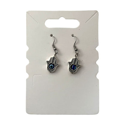 Add a touch of mystique and protection to your ensemble with our Evil Eye & Hamsa Earrings. Crafted from high-quality alloy, these earrings feature Hamsa Hand charms adorned with resin Evil Eye dangles. The intricate design combines the protective symbolism of both the Hamsa Hand and the Evil Eye, making these earrings a powerful talisman against negative energies. With a size of about 1.50 inches (38mm) long, these earrings are lightweight and comfortable to wear. The surgical stainless steel drop earrings ensure durability and hypoallergenic wear. Let these earrings serve as a stylish reminder of protection and positivity in your life.