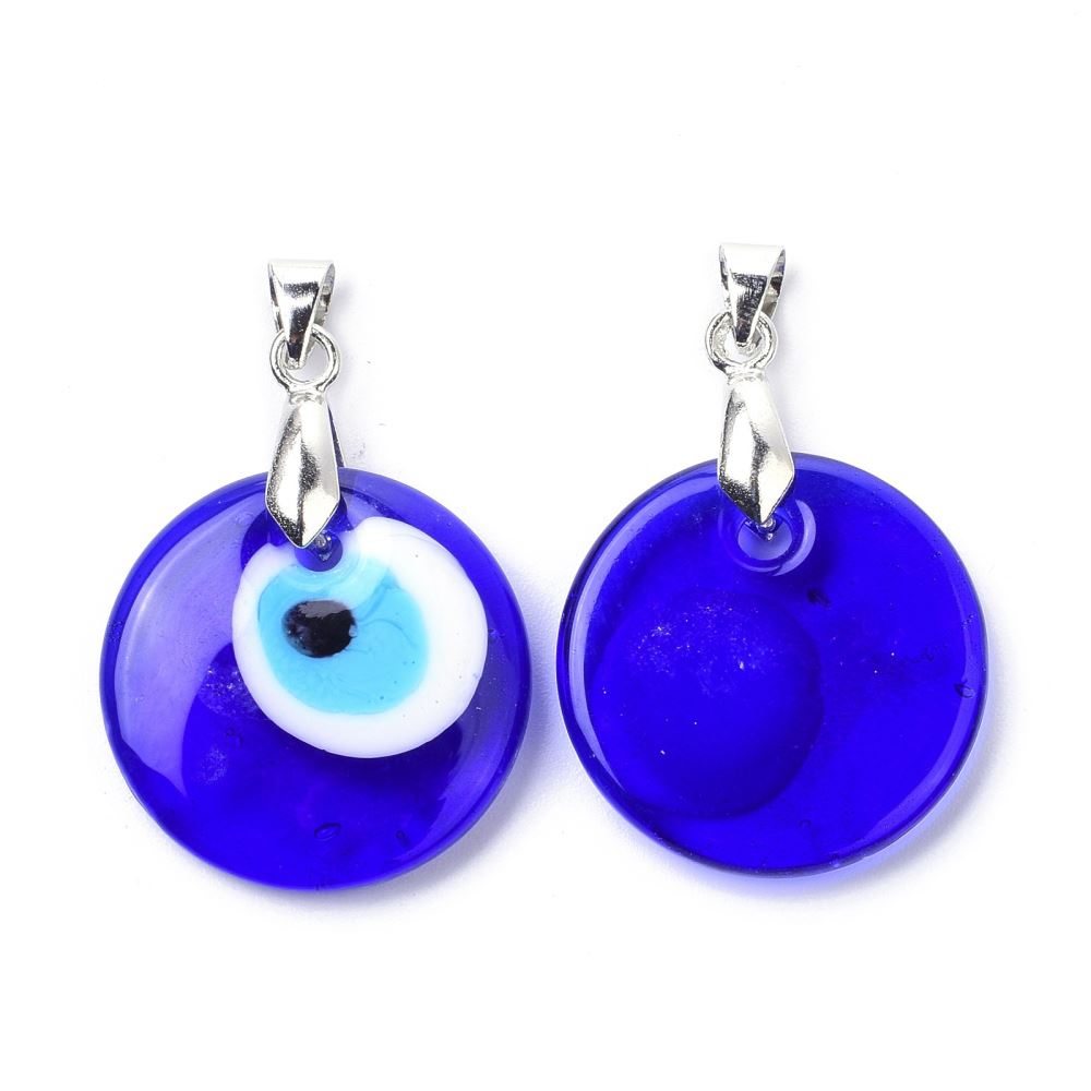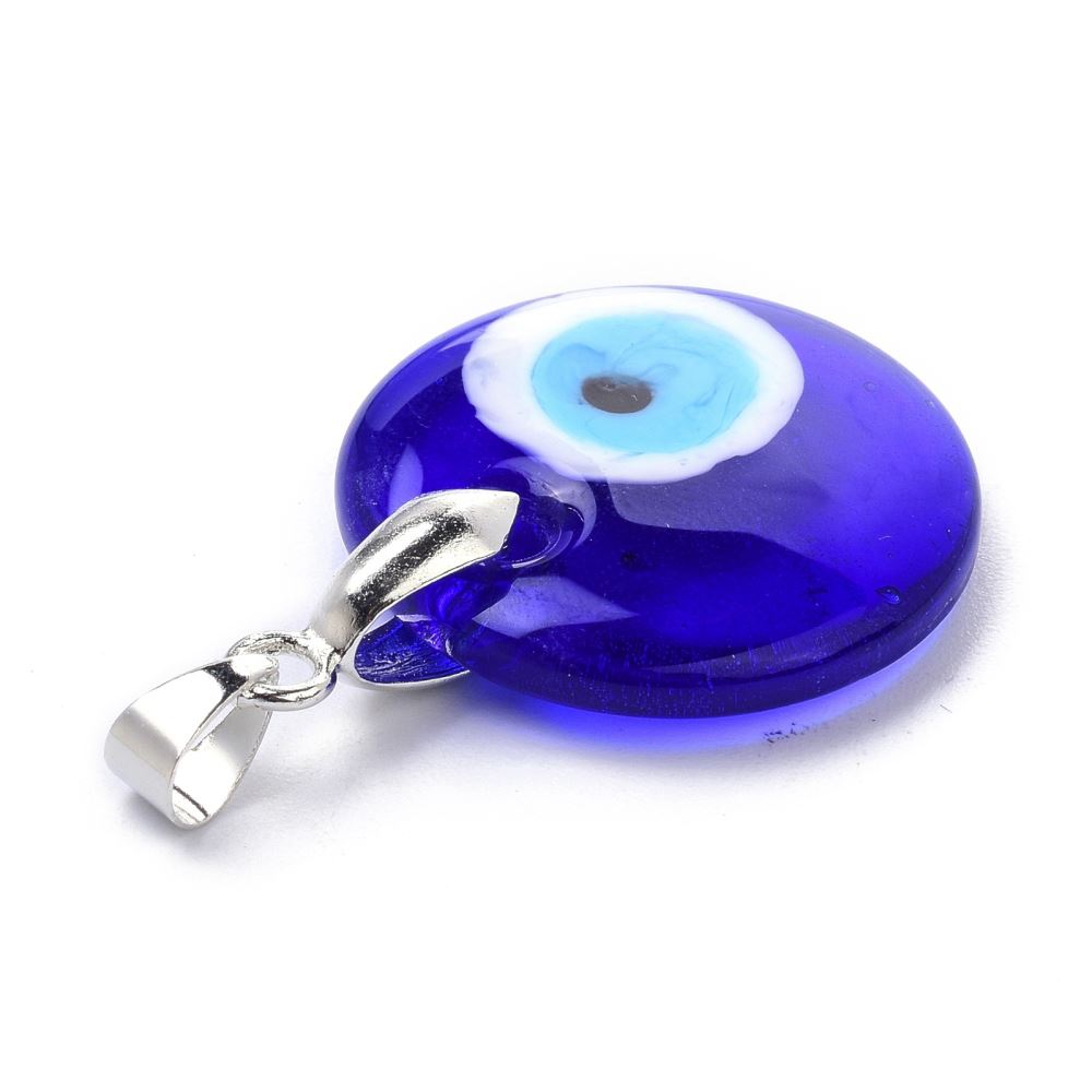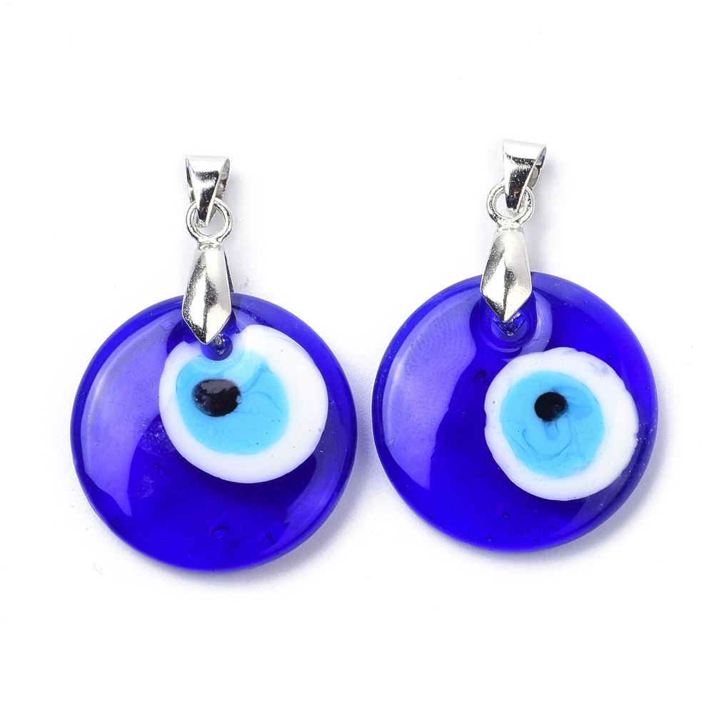 Evil Eye Pendant, Round. Size: about 0.98 inch (25mm) in diameter, 0.20 inch (5mm) thick, hole: 0.16x0.24 inch (4x6mm). The Evil Eye has been found throughout thousands of years of history across cultures. The symbol, most often depicted as four concentric circles in the shape of an eye, is used to ward off variations of evil intentions. Wearing any piece of jewellery with the Evil Eye protects the wearer while bringing them good luck.