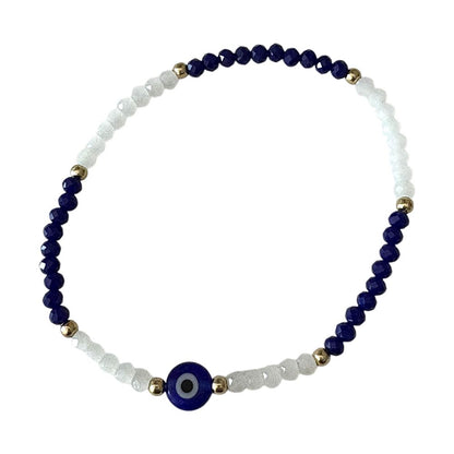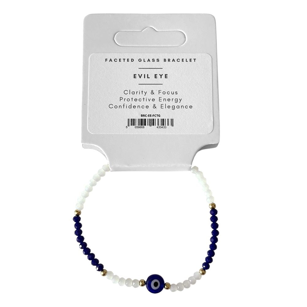 Faceted Glass Bracelet with central Evil Eye bead for a stylish yet protective look. Features faceted glass and stretch cord. Ideal for spiritual or fashion-focused collections.