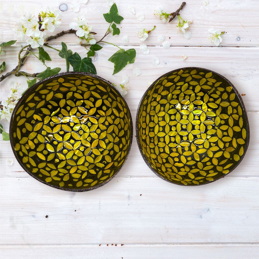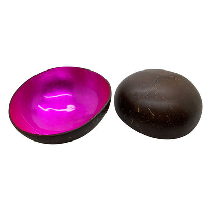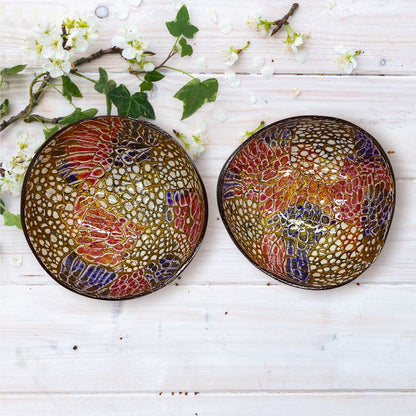 Enhance your home decor with our Hand-Painted Coconut Bowls, Lacquered, Set of 2. Crafted from upcycled coconut shells, each bowl features unique hand-painted designs and is meticulously coated with a durable lacquer finish. This process not only enhances their visual appeal but also ensures durability, making them resistant to damage from daily use. The bowls can be used as a decorative item, to store jewellery and accessories, or as a serving bowl for snacks and nibbles. Choose from a variety of captivating designs to add a touch of artistic flair to your space. Care: Easy to clean with soap and water, but should not be used in the microwave or dishwasher. Additionally, avoid exposing them to extreme temperatures or direct sunlight to preserve their vibrant colours and lacquered finish.
