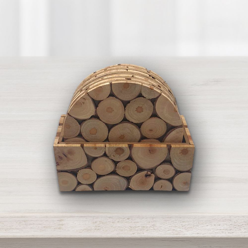 Handmade Sliced Wood Coaster Set with Holder, Set of 6, 10cm, Round