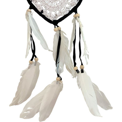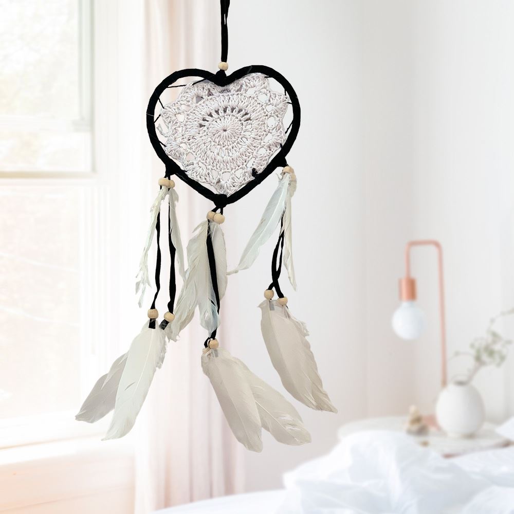 12cm heart-shaped dream catcher with feathers and beads. Ethically handmade to symbolise peace and affection.