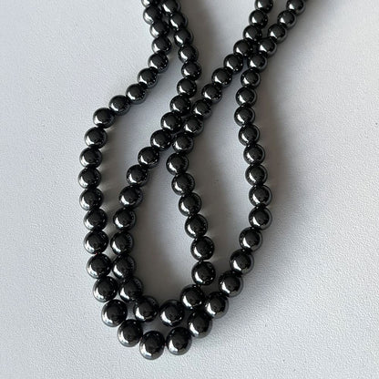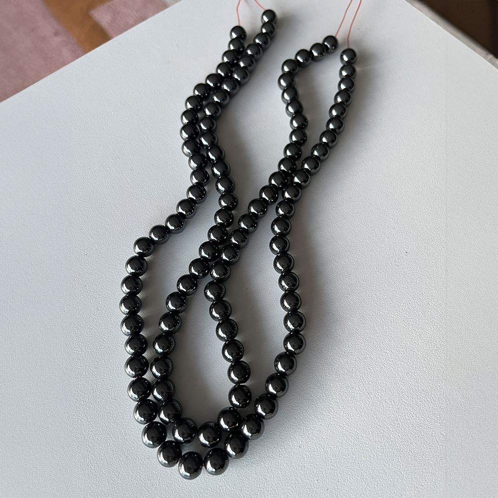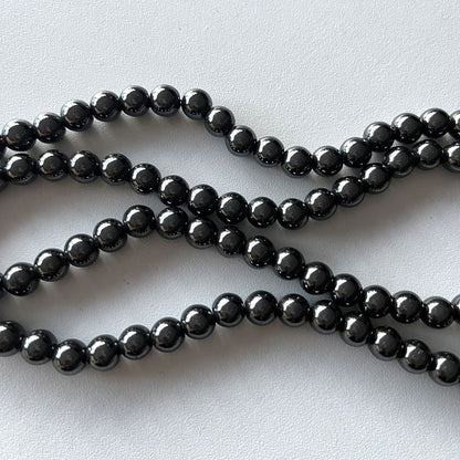 Polished Hematite Round Beads in 4 sizes: 4mm (80pcs), 5mm (73pcs), 6mm (53pcs), and 8mm (43pcs). Ideal for jewellery makers and craft supply shops seeking quality, grounding beads with a metallic finish.