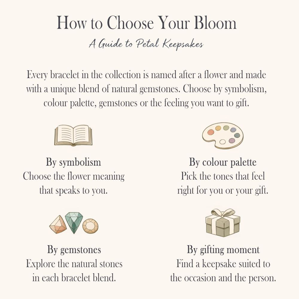 Petal Keepsakes Gemstone Bracelet, Peony, presented on a beautifully designed card and inspired by the flower’s symbolism of prosperity, good fortune and abundance. Its intentions come from both the peony meaning and the gemstone blend of Malachite, Black Tourmaline, Tiger's Eye, Green Aventurine, Citrine, Rutilated Quartz, Clear Quartz and Amazonite, creating an uplifting jewellery line for gift shops, floristry-inspired collections and sentimental retail displays.