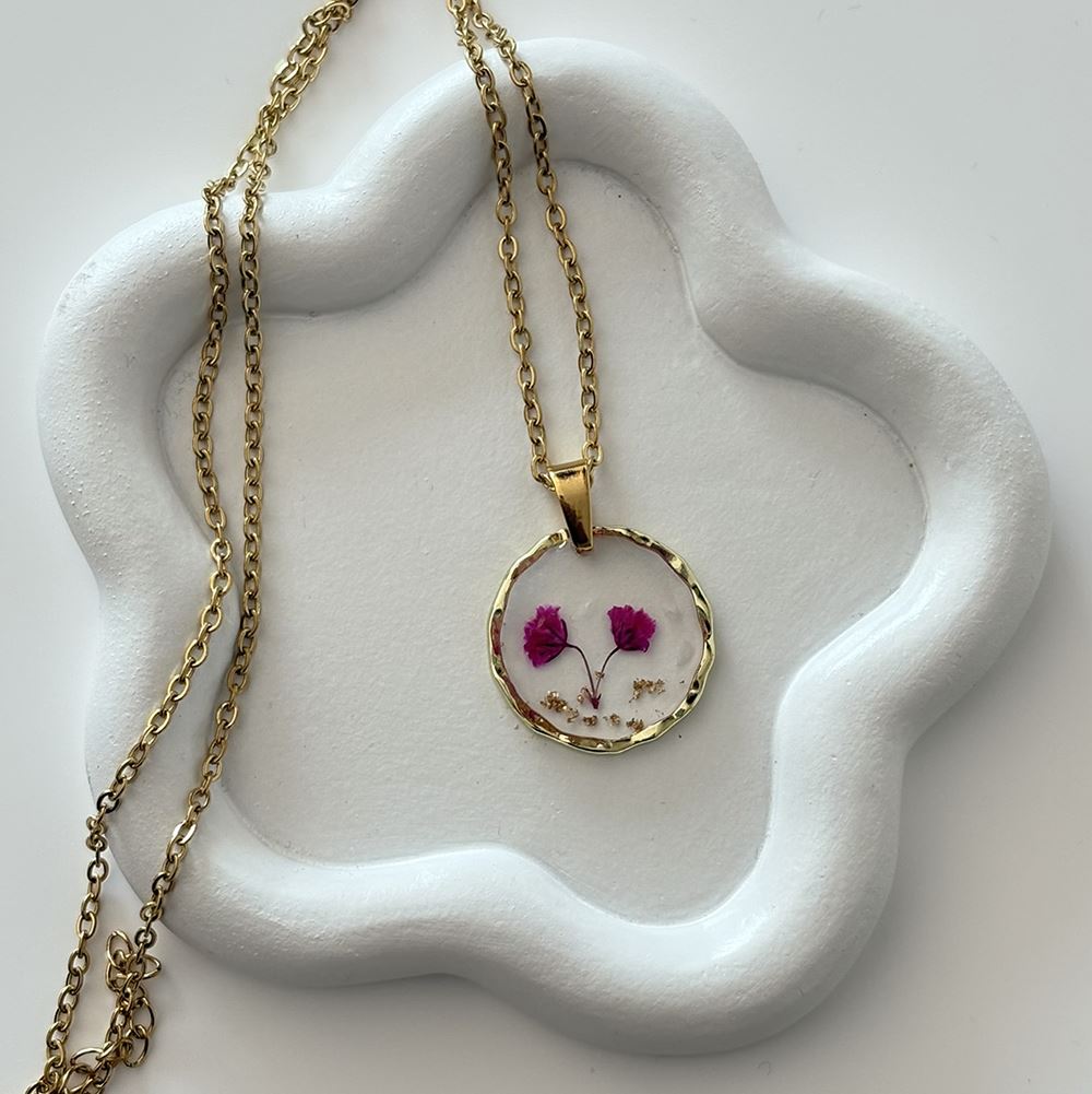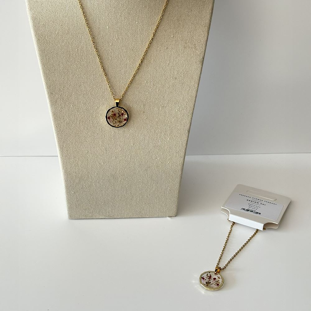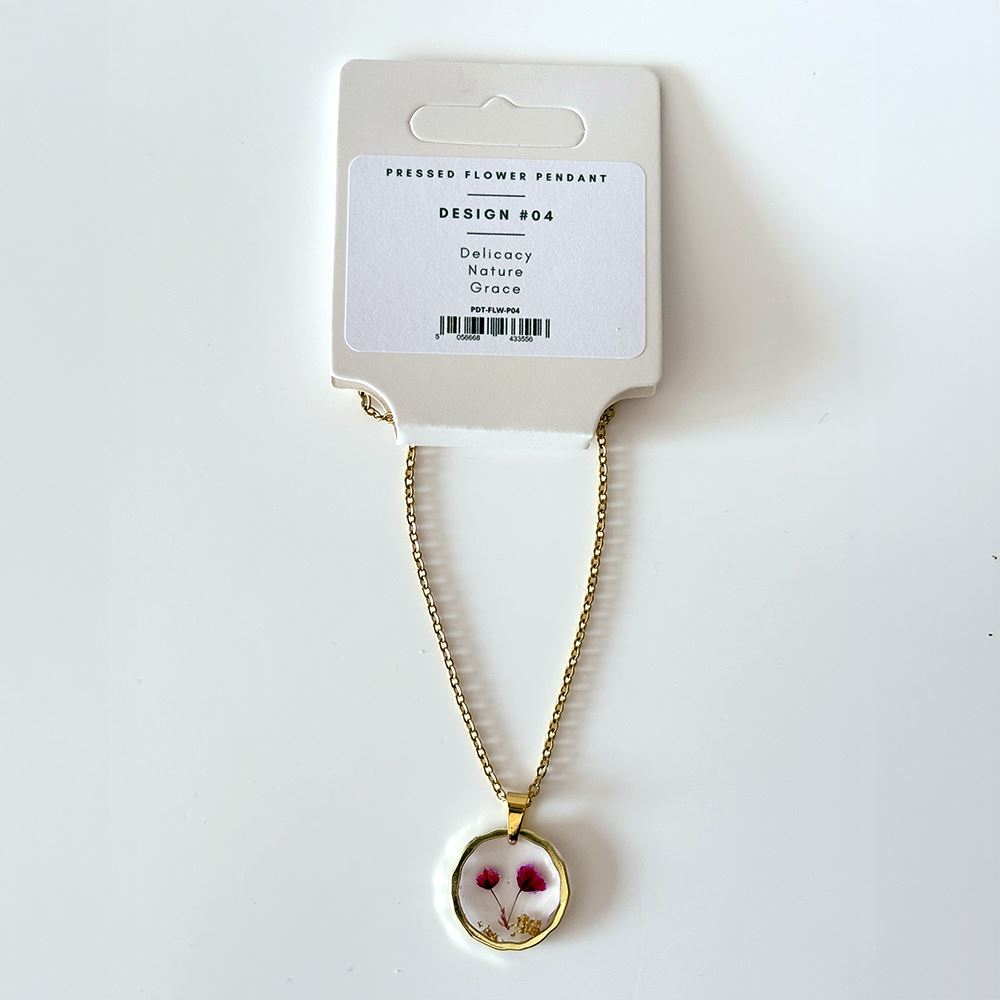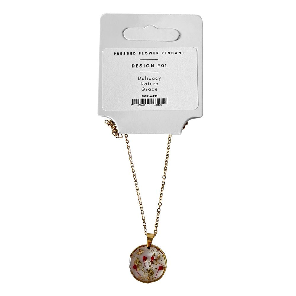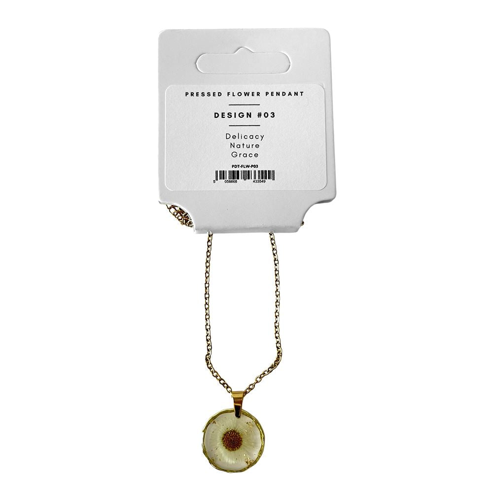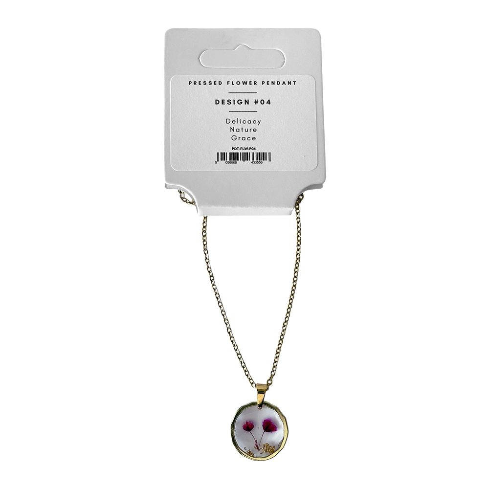 Pressed Flower Pendant with gold-toned chain, featuring real flowers in resin. Four designs available. A graceful piece for nature-inspired jewellery ranges.