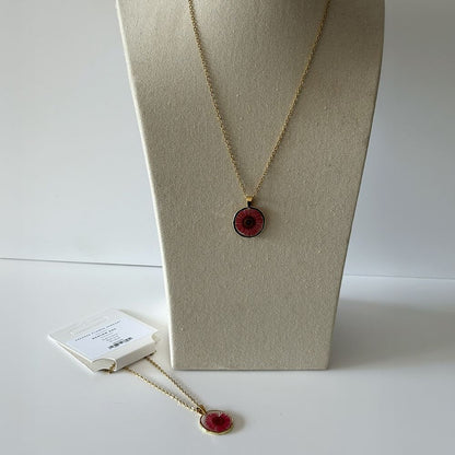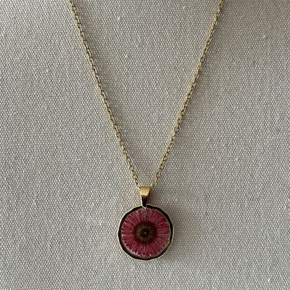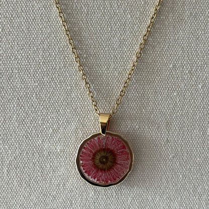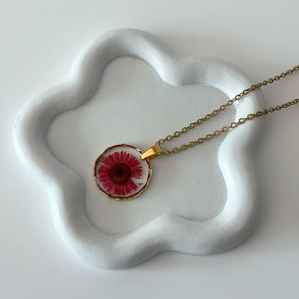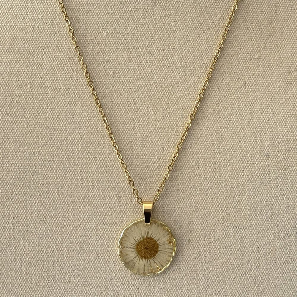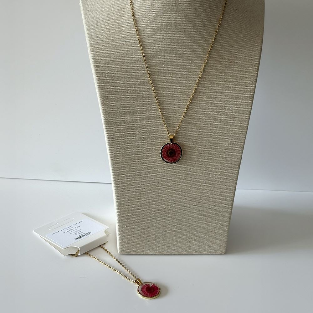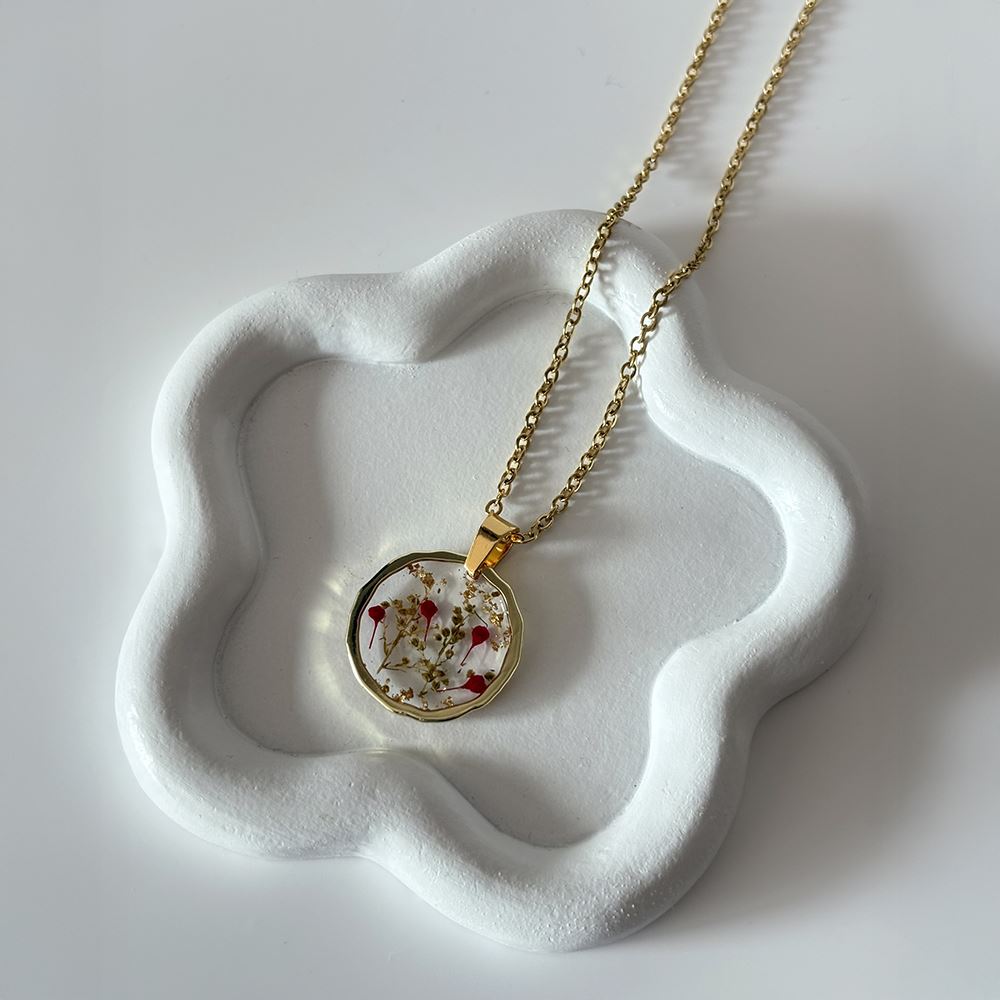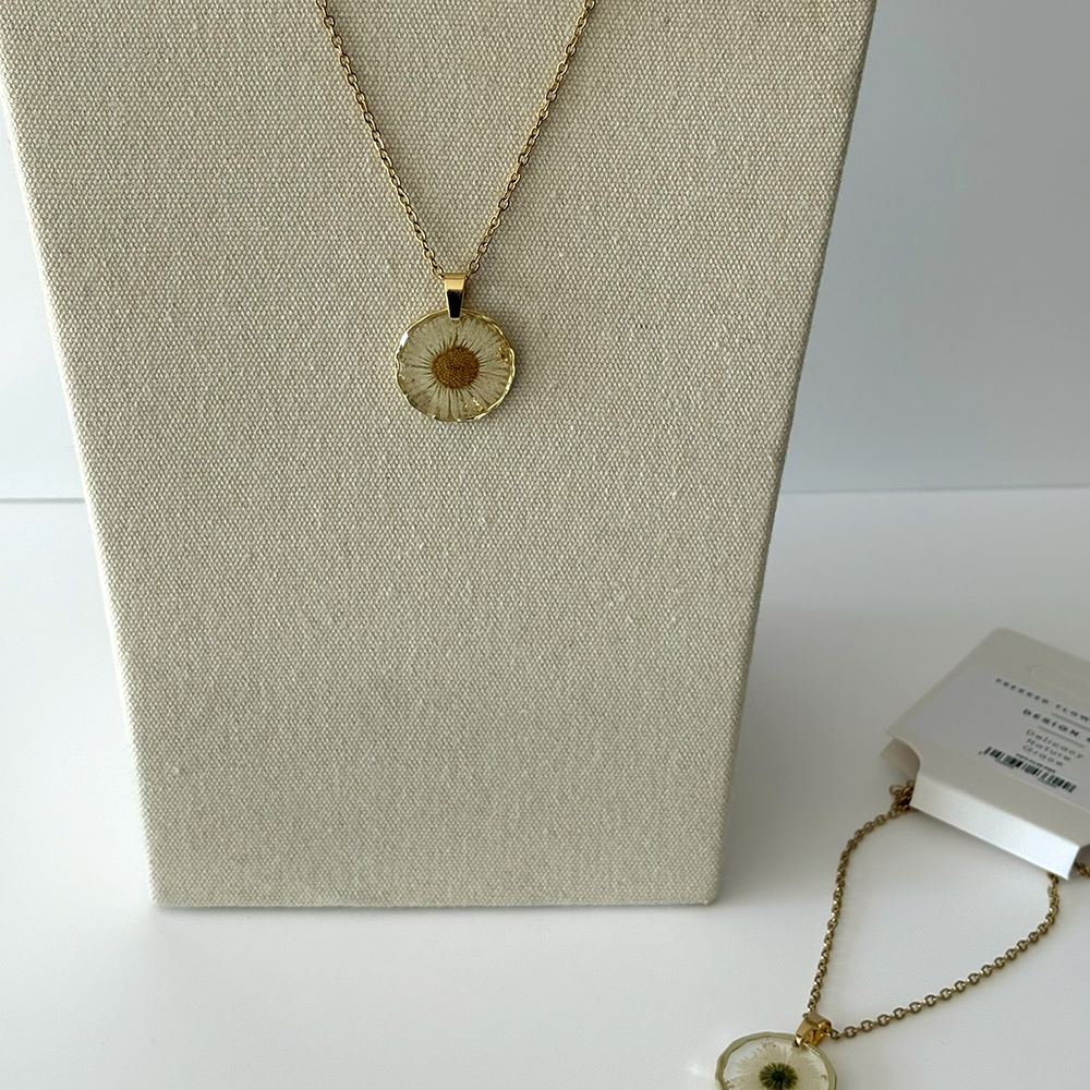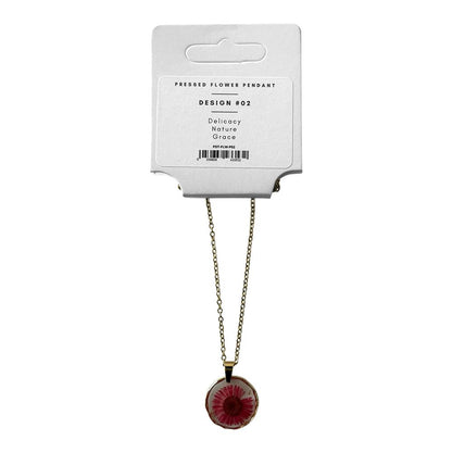Pressed Flower Pendant with gold-toned chain, featuring real flowers in resin. Four designs available. A graceful piece for nature-inspired jewellery ranges.
