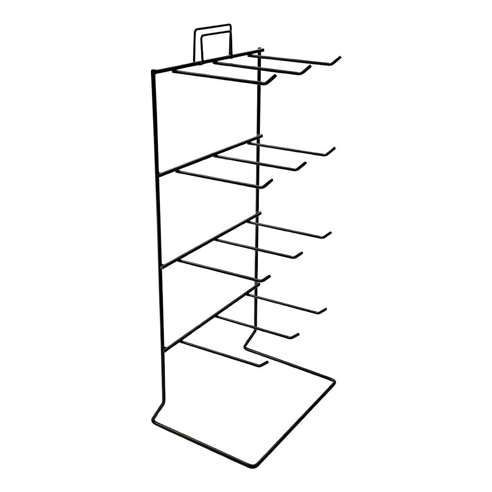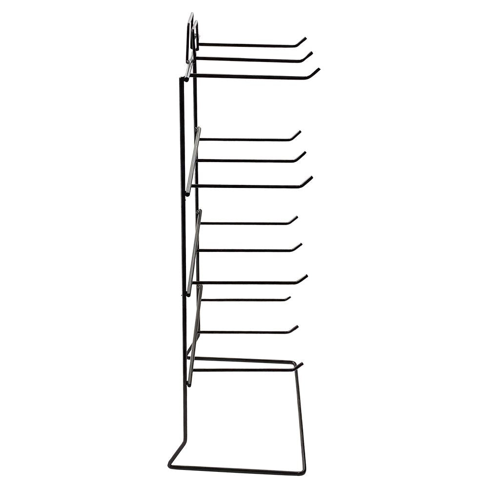 Freestanding Product Display Hanger (52.4x24.4x17cm) with 12 fixed 12cm hooks across four tiers. Made from 4mm wire with black finish and header clip. Ideal for retailers displaying keyrings, wristlets, and other small items.