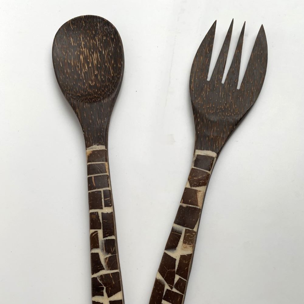Coconut Wood Salad Servers with elegant inlay designs. Handmade and eco-friendly, measuring 30x7cm. A perfect addition to sustainable kitchenware ranges.