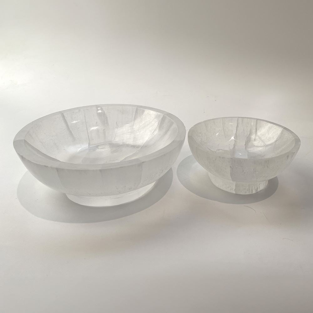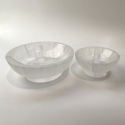 Polished Selenite Bowl with a smooth finish, available in different sizes. Ideal for holding crystals or jewellery. A popular choice for crystal shops, wellness boutiques, and spiritual retailers.
