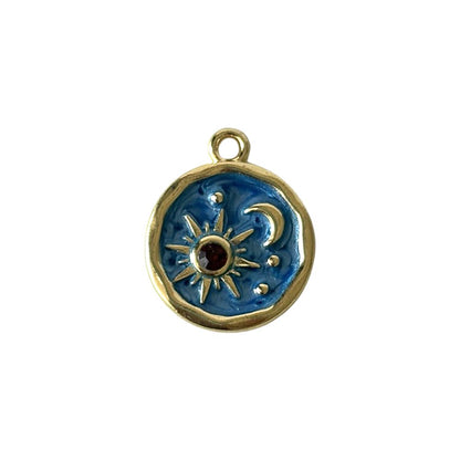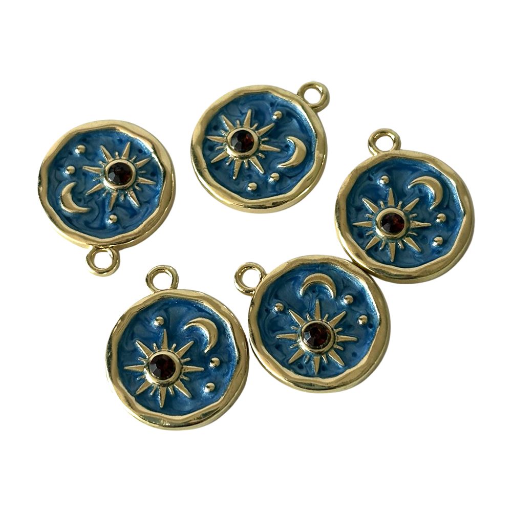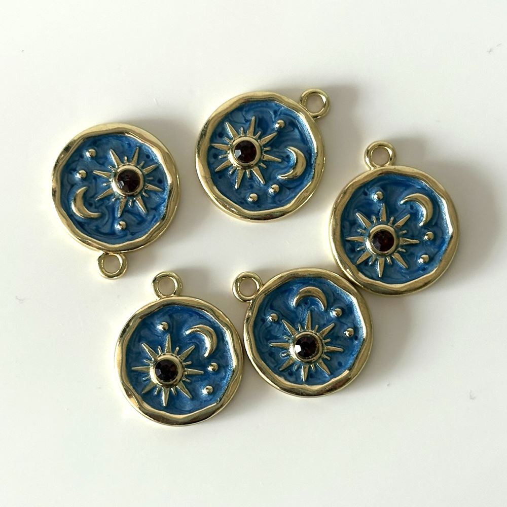 Gold-tone celestial charm (20.5x17x3mm, 2mm hole) with blue enamel and rhinestone centre. Ideal for jewellery makers, craft suppliers, and spiritual-themed product lines.