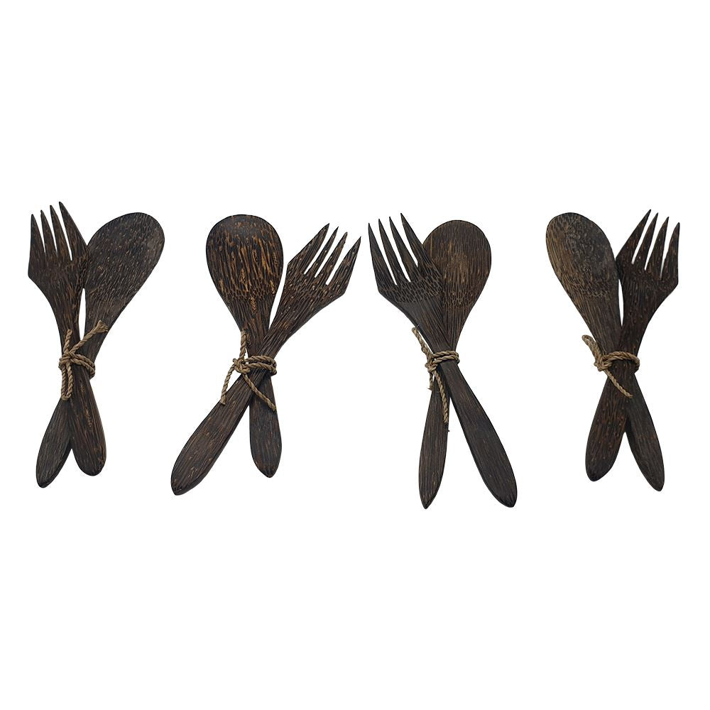The Sono Wood Cutlery Set (Spoon & Fork) - 4 Sets are 100% natural and made from sustainable sources. They have a beautiful, distinctive grain and colour. It can be used for outdoors, picnics, entertainment and much more. With the appropriate care can last a lifetime. Do not soak in water or put in the dishwasher. Wash with warm, soapy water and dry immediately.