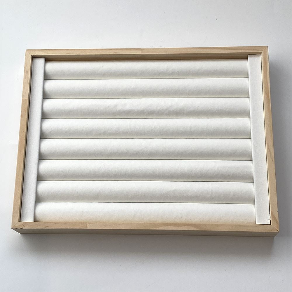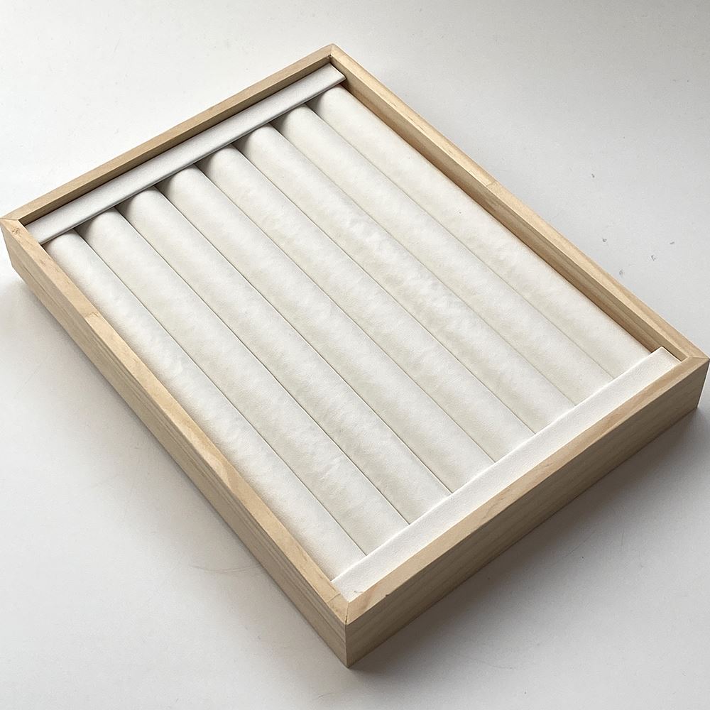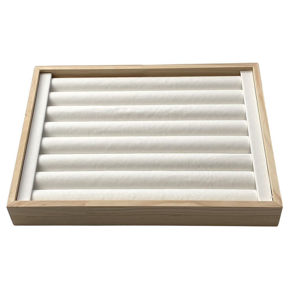 Wooden Ring Display Tray (24x18x3cm) with velvet-lined slots. Lightweight and elegant, ideal for jewellers, market vendors, and retail display. Perfect for showcasing rings and small accessories.