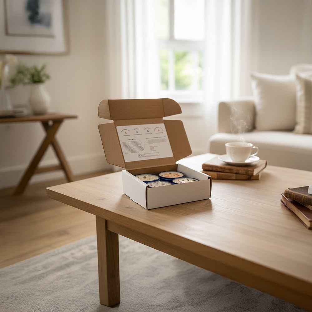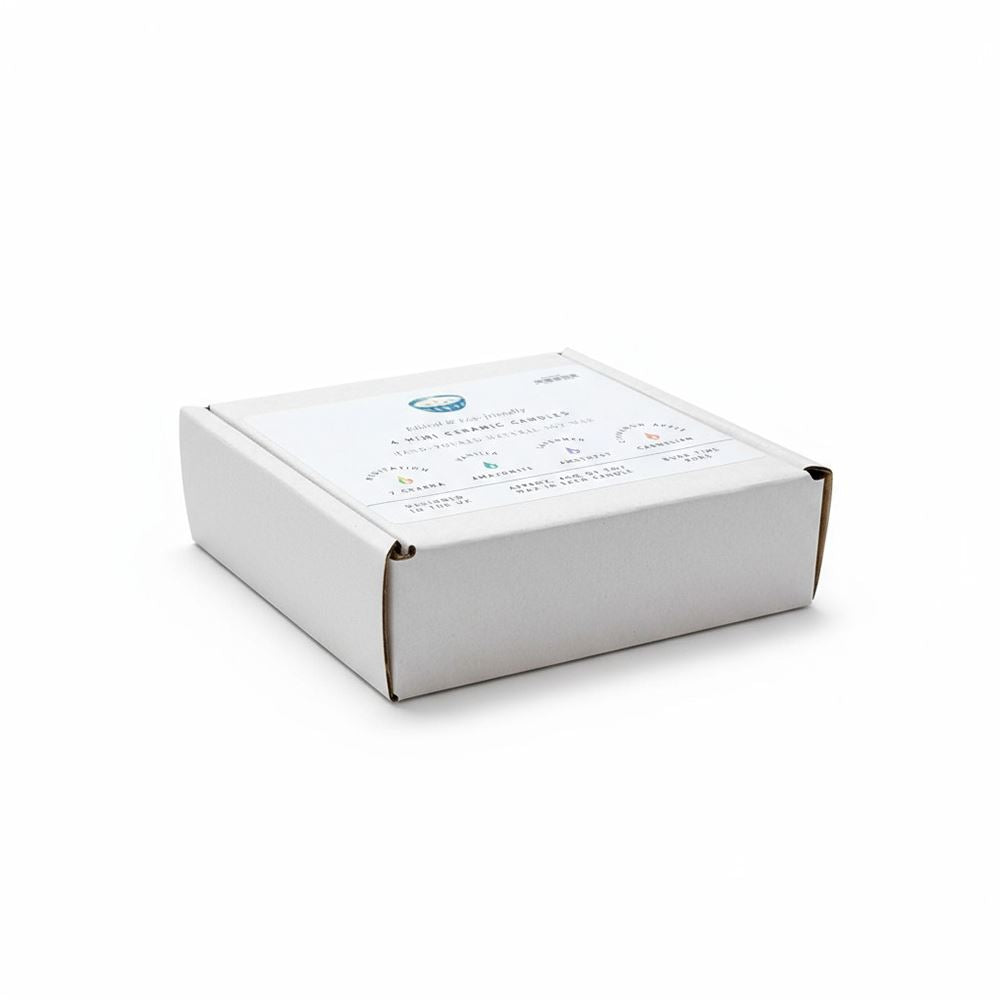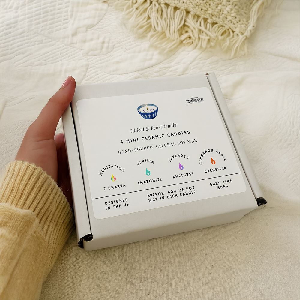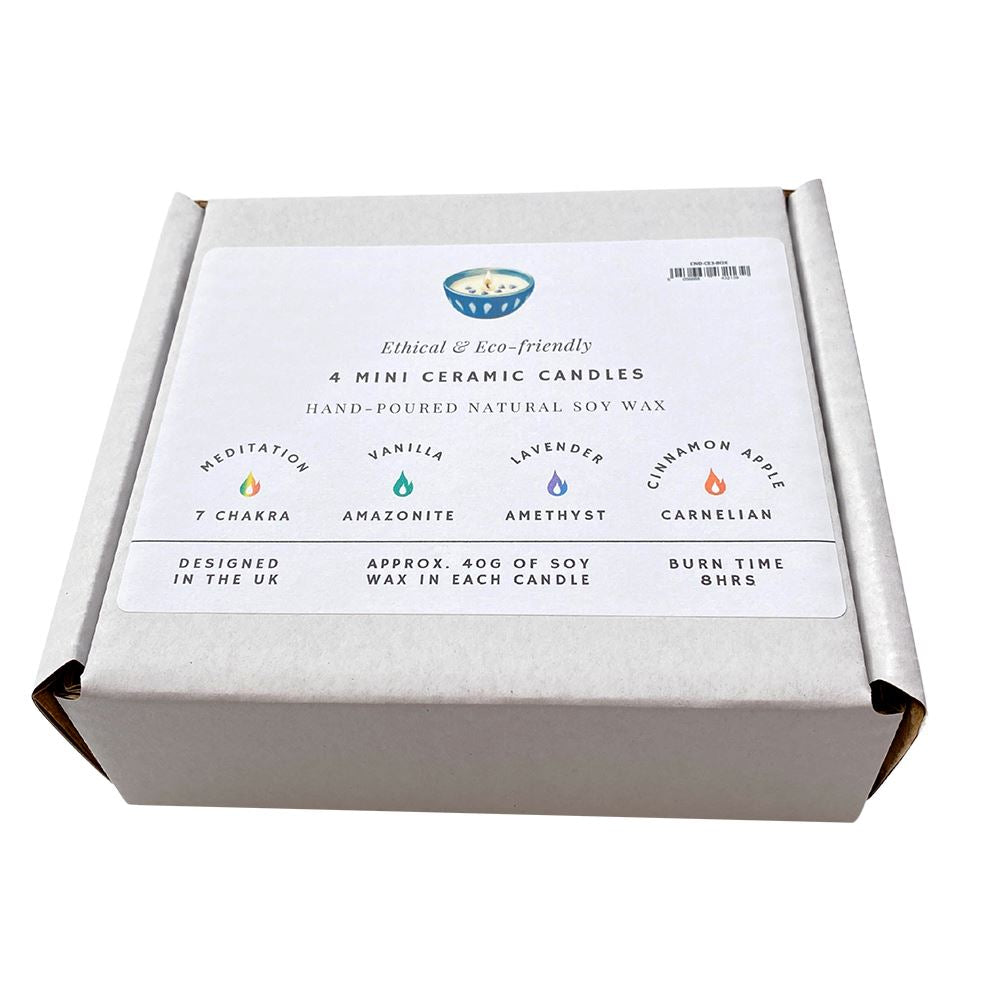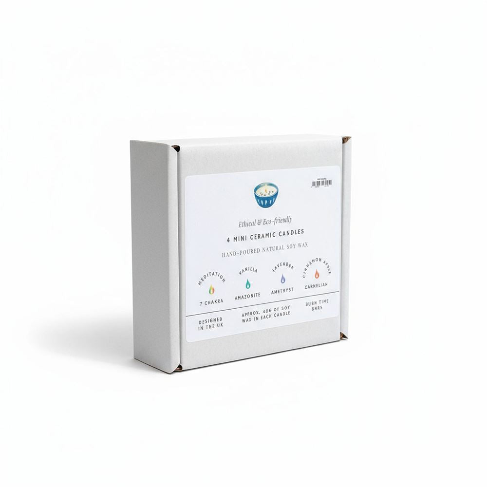 Set of 4 Mini Ceramic Bowl Candles with natural soy wax, assorted scents, and embedded crystals. Each burns for approx. 8 hours. Ideal for gift shops, home fragrance retailers, and wellness boutiques.