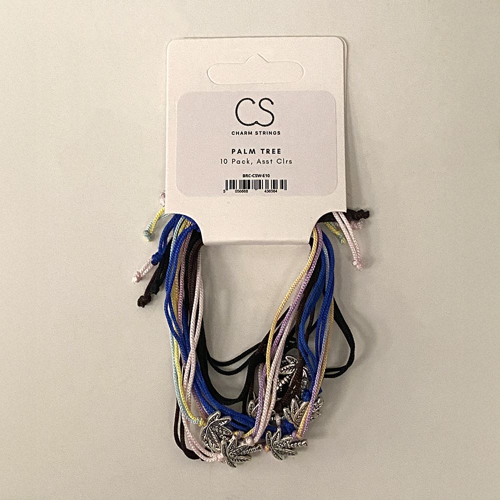 Charm Strings, Pack of 10 in assorted colours with silver-tone charms. Adjustable, lightweight and perfect for gift shops, fashion retailers, and lifestyle collections looking for stylish multipacks.