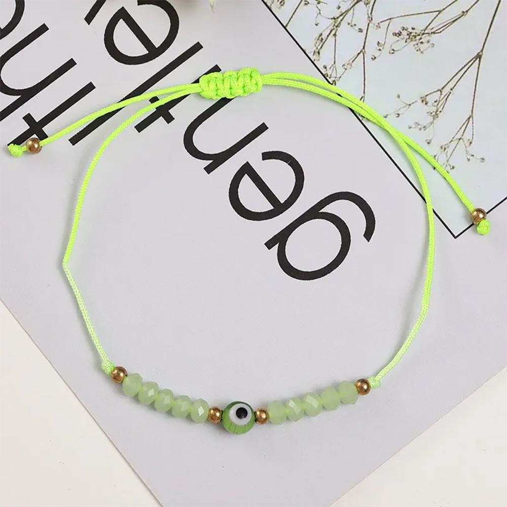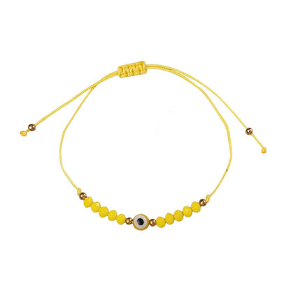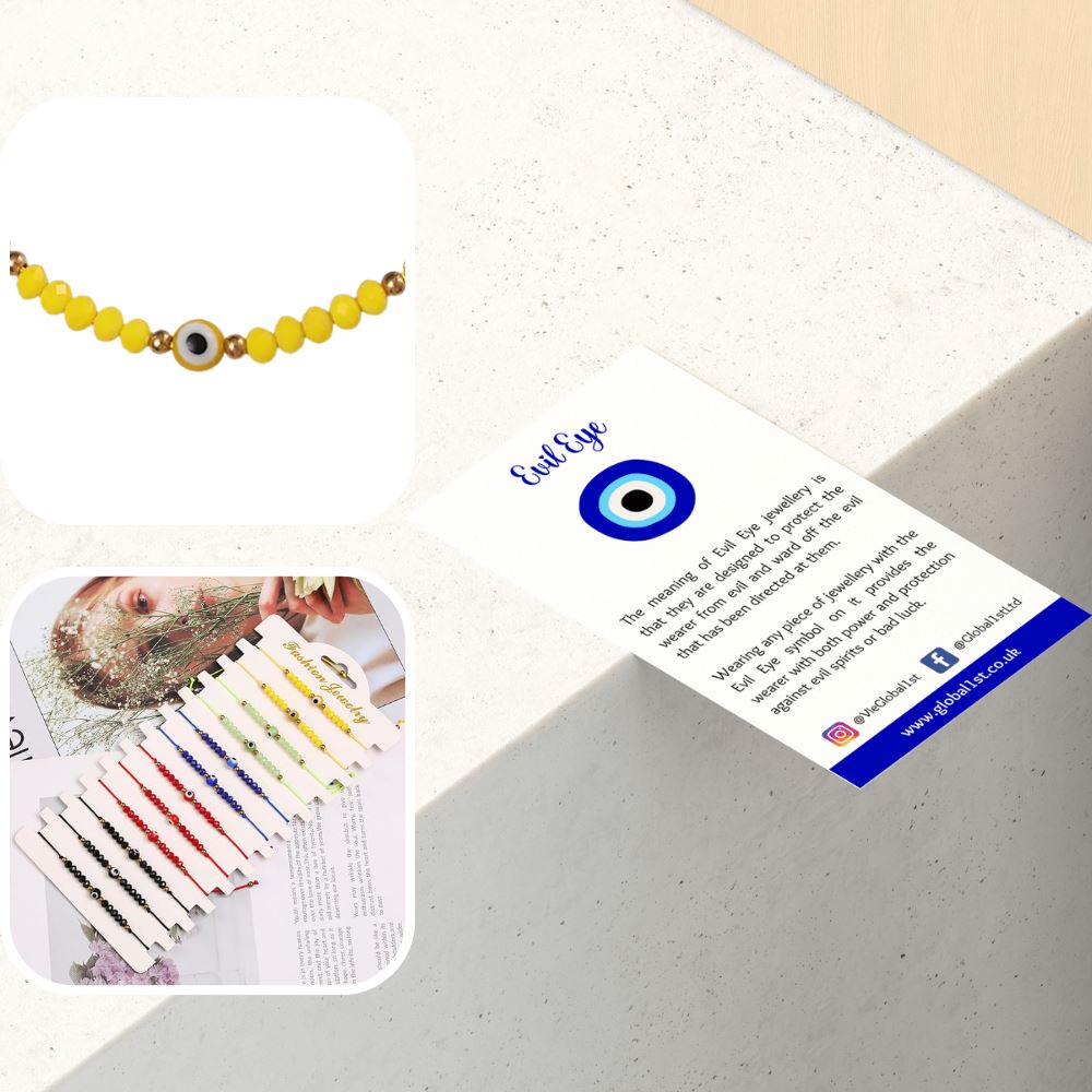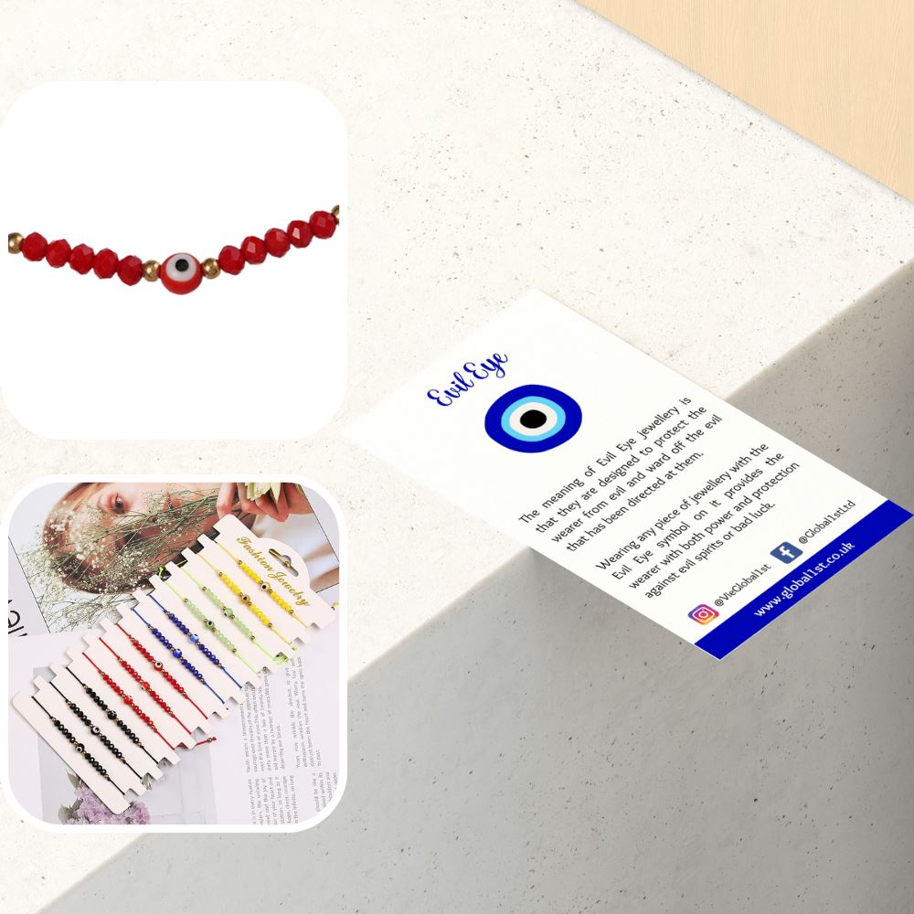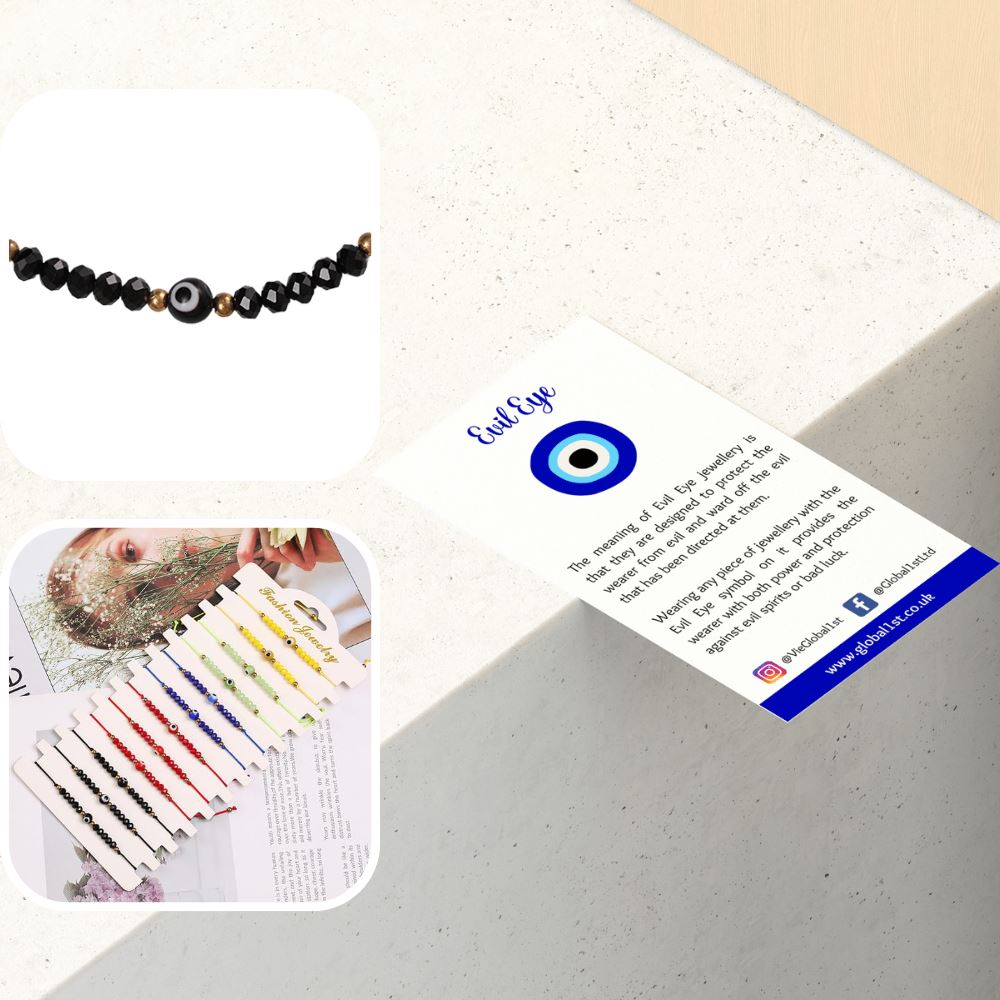Adjustable bracelet with faceted glass beads and Evil Eye charm. Available in five colours. Lightweight, colourful, and ideal for gifting or layering. A popular item for protective jewellery displays.