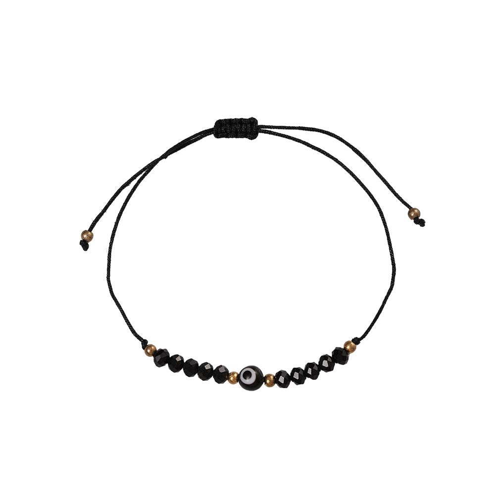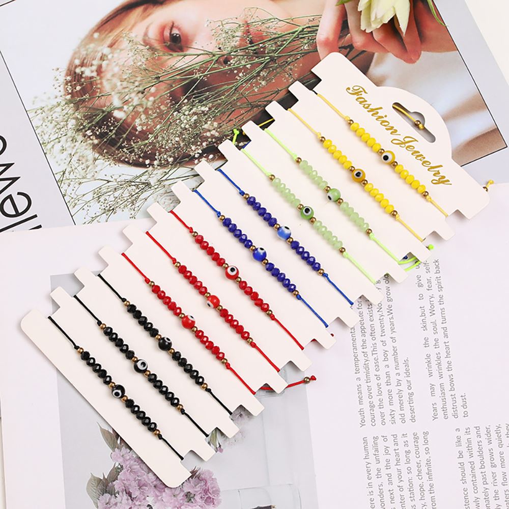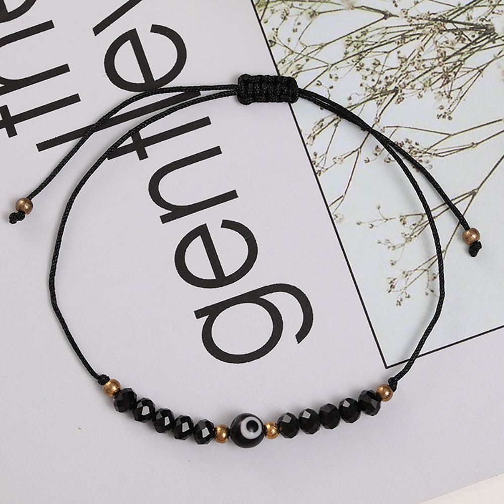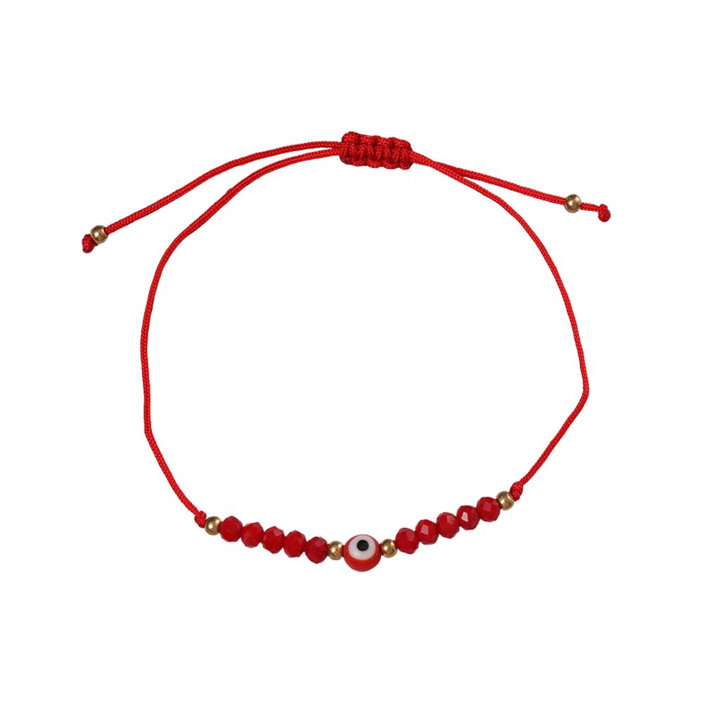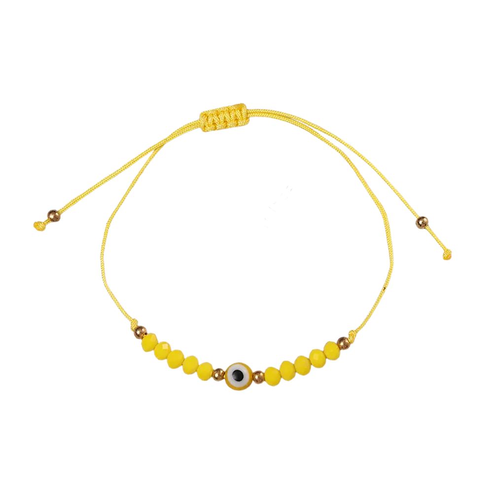 Adjustable bracelet with faceted glass beads and Evil Eye charm. Available in five colours. Lightweight, colourful, and ideal for gifting or layering. A popular item for protective jewellery displays.