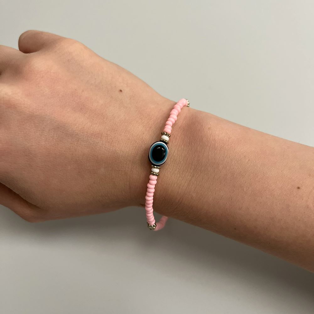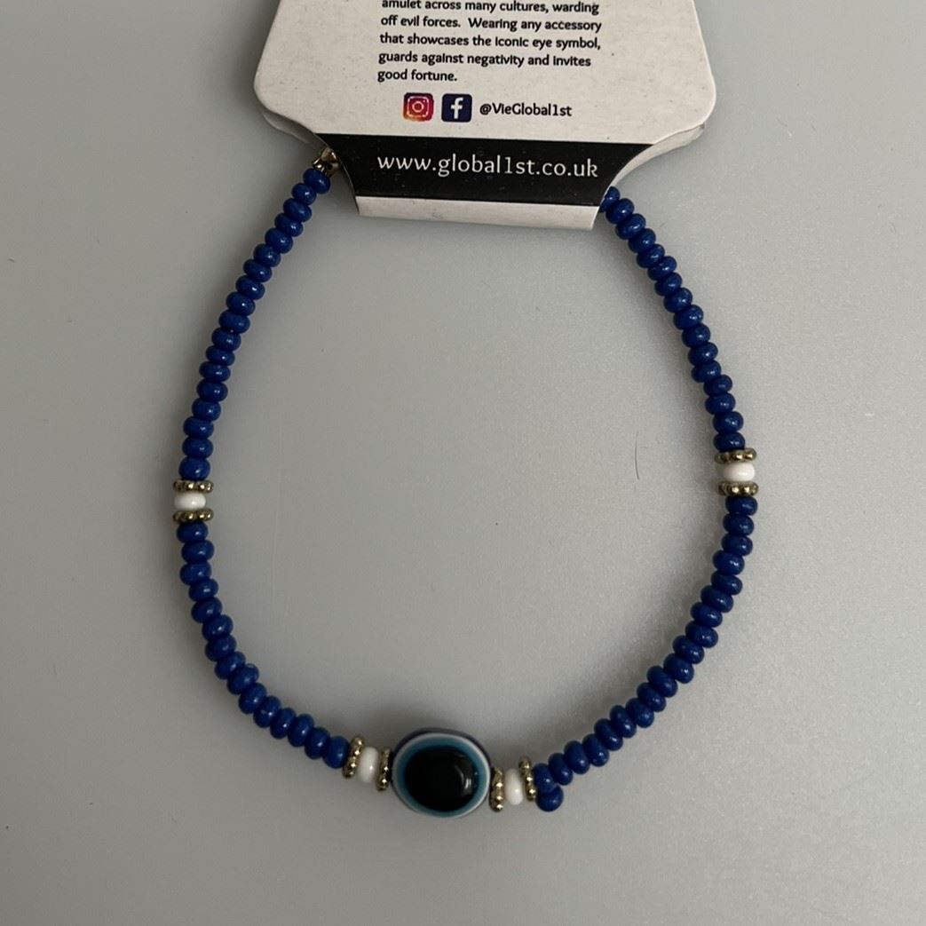 Evil Eye bracelet with coloured seed beads, signature white accents and metallic spacers. Lightweight and symbolic, ideal for displays that blend spiritual meaning with modern design.