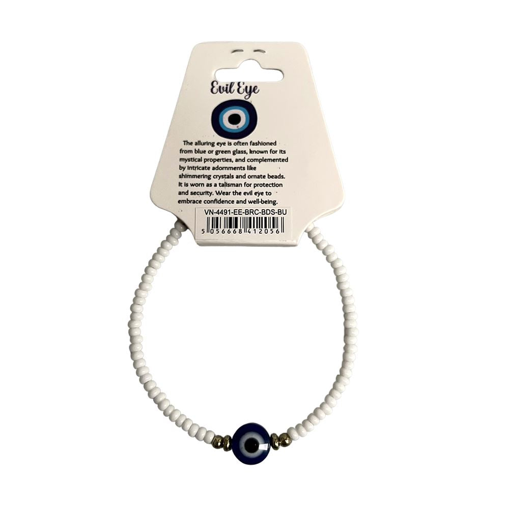 Beaded bracelet with central Evil Eye charm and two gold-tone beads on each side. Lightweight and colourful. A symbolic piece ideal for display and everyday wear.