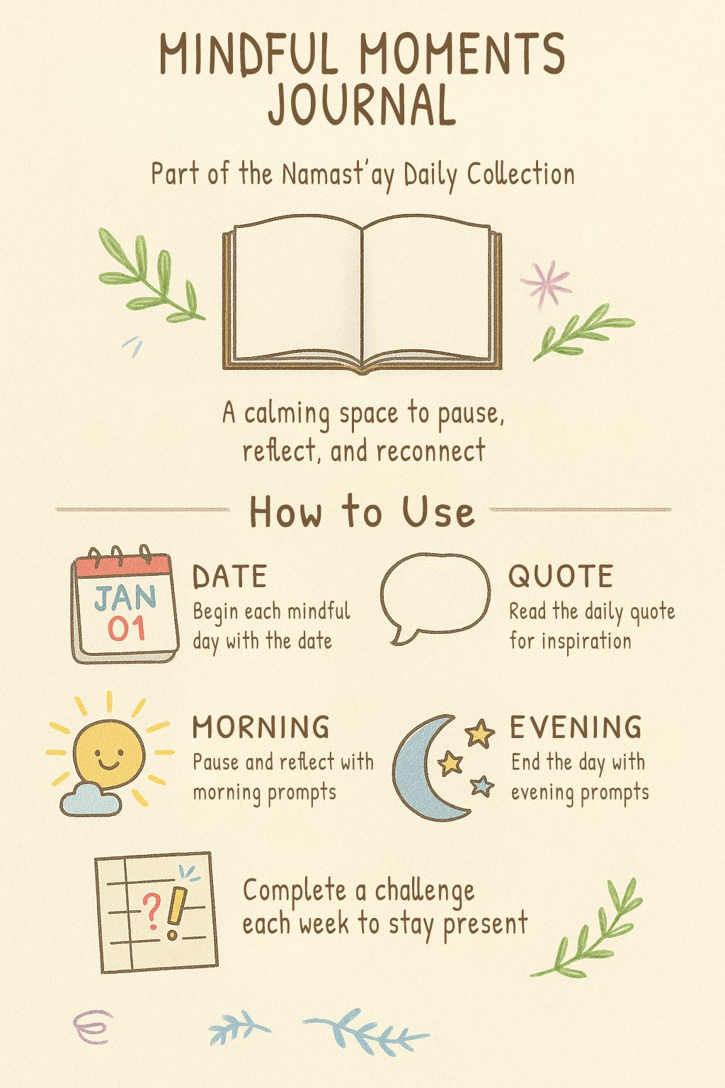 Mindful Moments Journal - Volume I, 3-month paperback with daily prompts, weekly challenges and quotes. Includes a mulberry paper bookmark with assorted floral designs. Ideal for bookshops, wellness stores and gifting ranges.