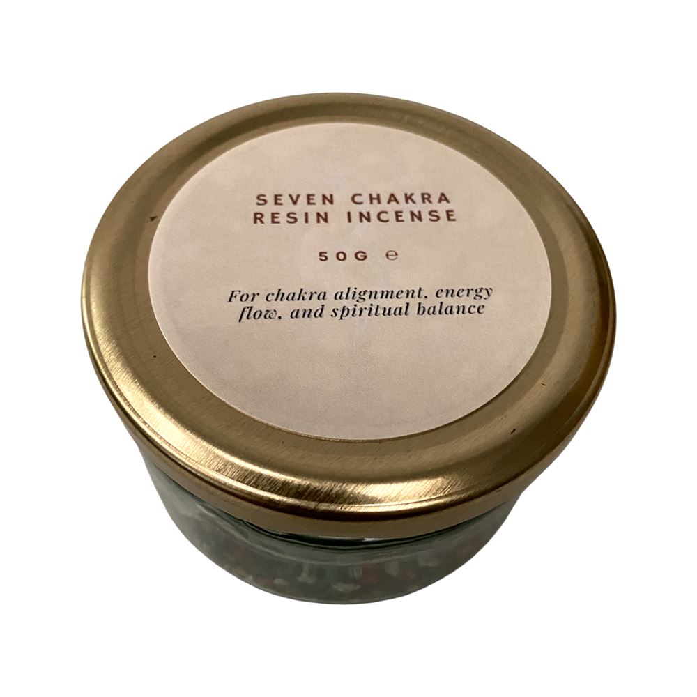 The Seven Chakra Resin Incense is a vibrant blend of natural resins, crafted to align and harmonise the seven energy centres of the body. When burned on charcoal, it releases a balanced and uplifting fragrance, supporting meditation, healing, and spiritual rituals. Presented in a 50g glass jar with a golden lid, it combines timeless tradition with a refined and elegant presentation.