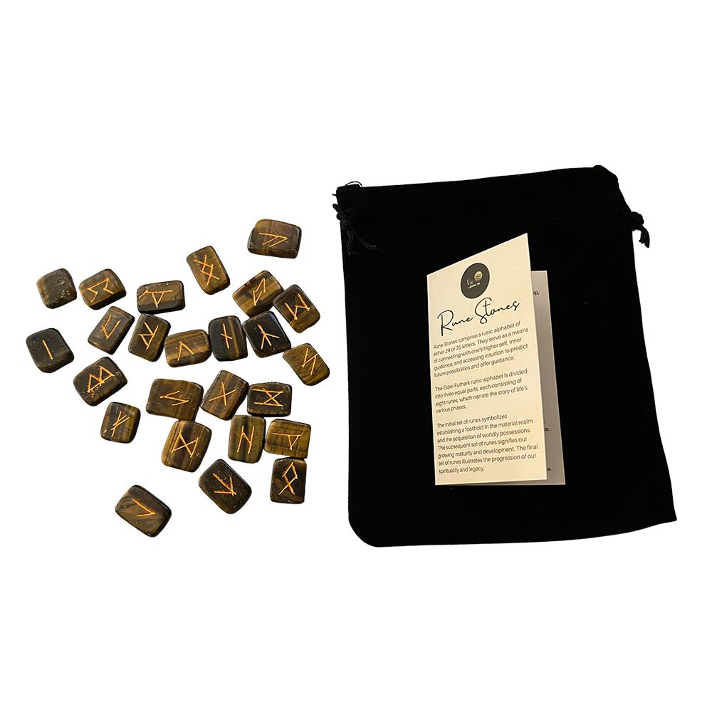 Rectangular Elder Futhark Rune Set with 25 engraved gemstone stones and a drawstring pouch. Includes the 24 traditional runes plus one extra stone, used for single draws or casting spreads. Ideal for spiritual shops, crystal retailers and gift boutiques.