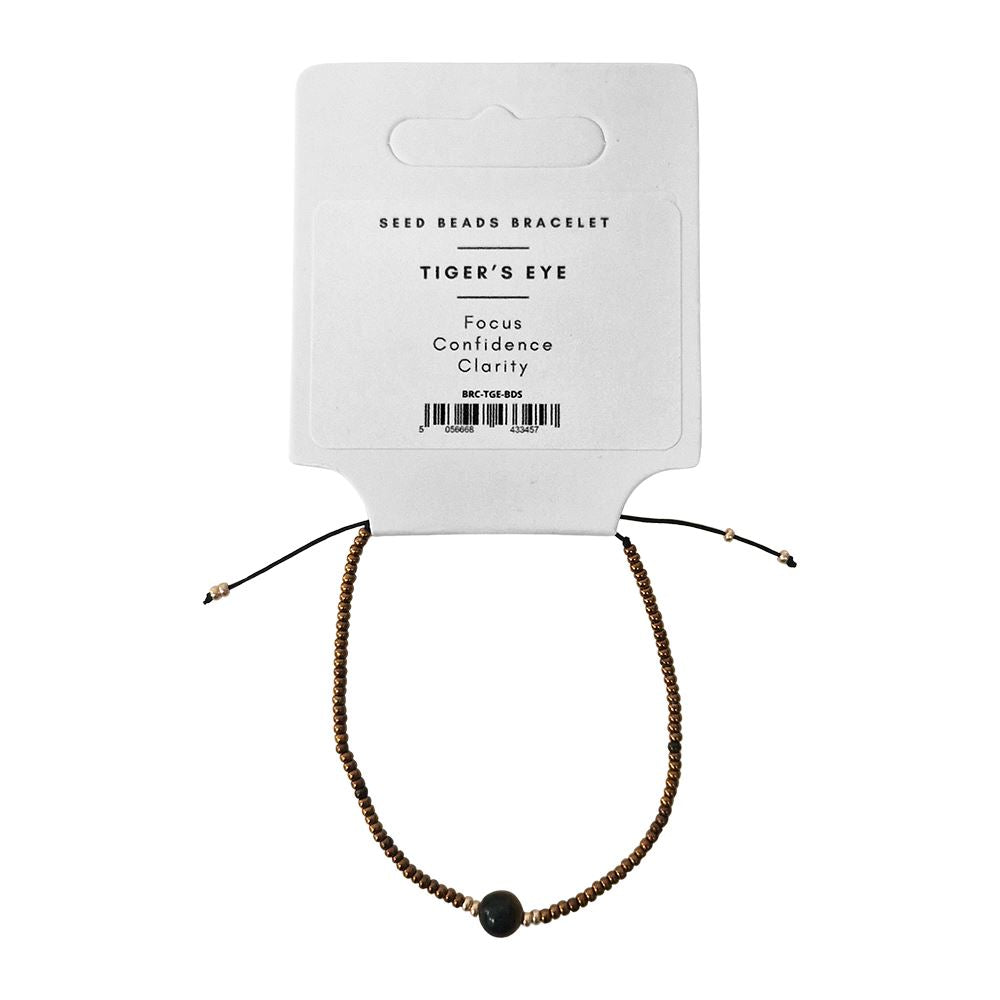 Handmade seed bead bracelet with braided black thread and natural Tiger’s Eye centre. Earthy tones and adjustable fit make it ideal for crystal retailers, gift shops, and wellness collections.